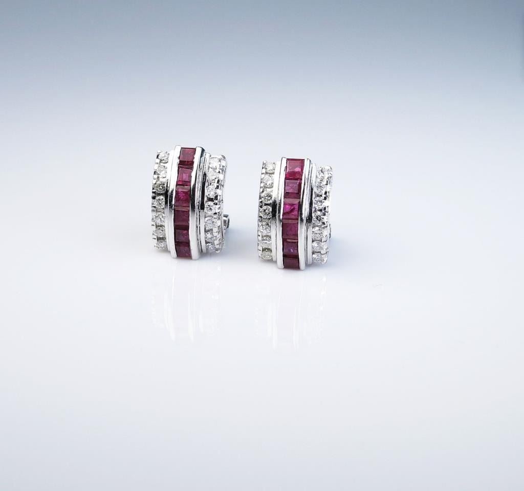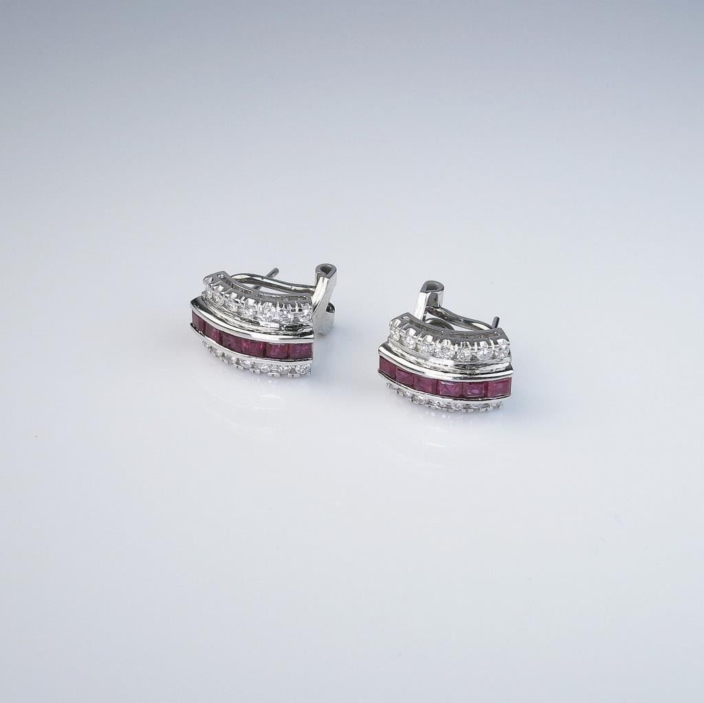 Lot 1595 Elegant Ruby and Diamond Semi-Hoop earrings set with 12 Fine princess cut rubies and 28 round diam