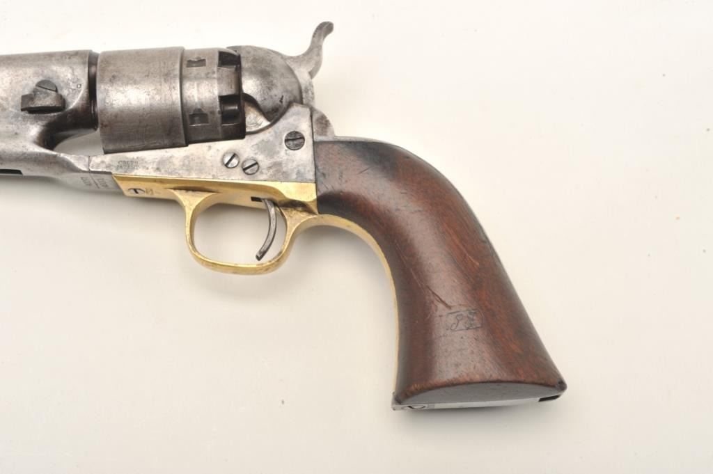 Colt 1860 Army .44 caliber percussion revolver, S/N 42091. Martially inspected with mismatched numbers on the trigger guard and back strap (41320). The cylinder number matches the barrel and frame. The grips arenear fine with well-defined cartouche. 10%-20% cylinder scene remains with light patina finish and good markings. Good action. Good to very good overall. (Antique) Est.: $800-$1600