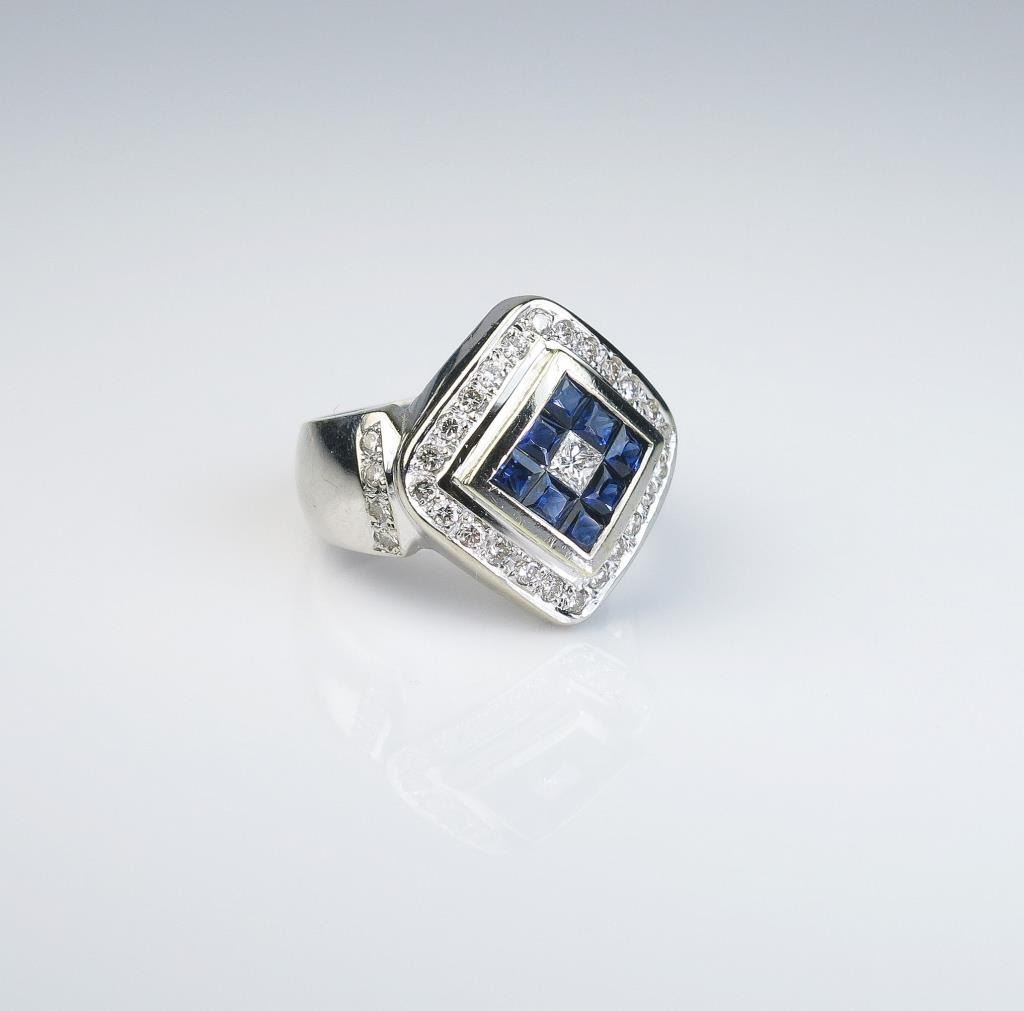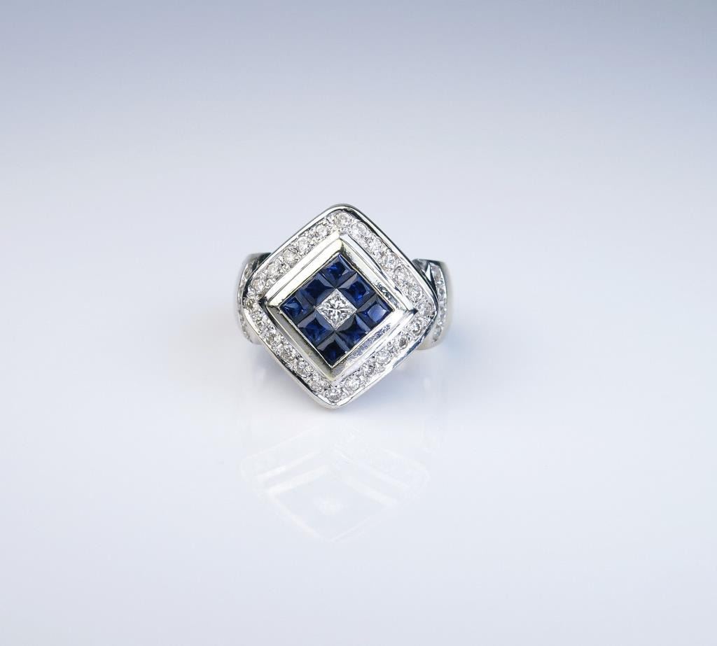 Striking Blue Sapphire and Diamond Ring in bold design featuring 8 blue sapphires invisible set with princess cut diamond in center framed by 32 round cut diamonds weighing 0.60 carats total with F-G colorsand VS clarity set in 14 karat white gold. Retail $2,500-$3,000 Estimates $1,200-$1,600