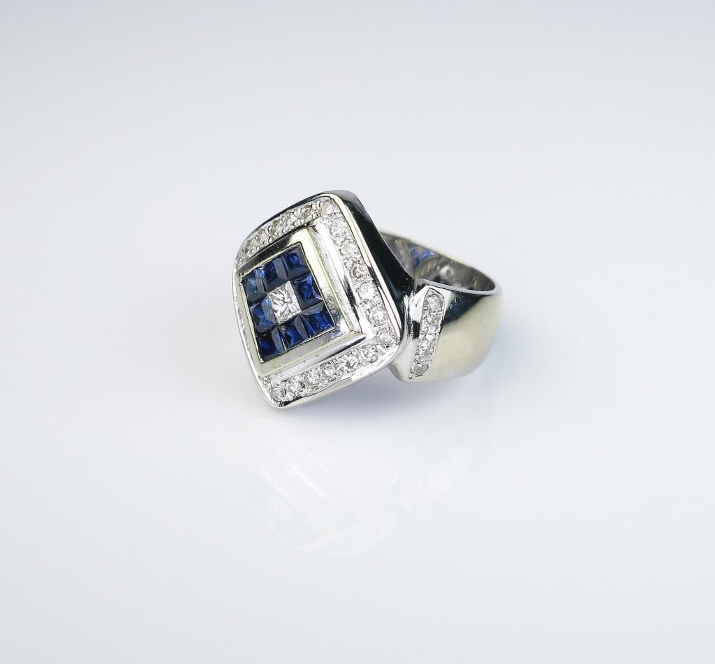 Lot 1615 Striking Blue Sapphire and Diamond Ring in bold design featuring 8 blue sapphires invisible set wi