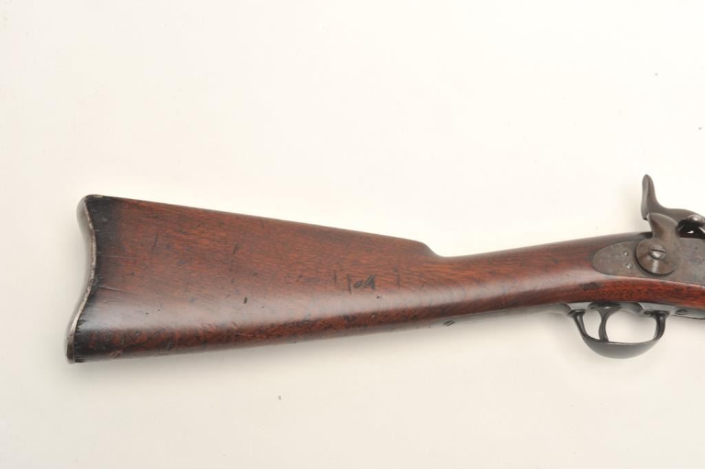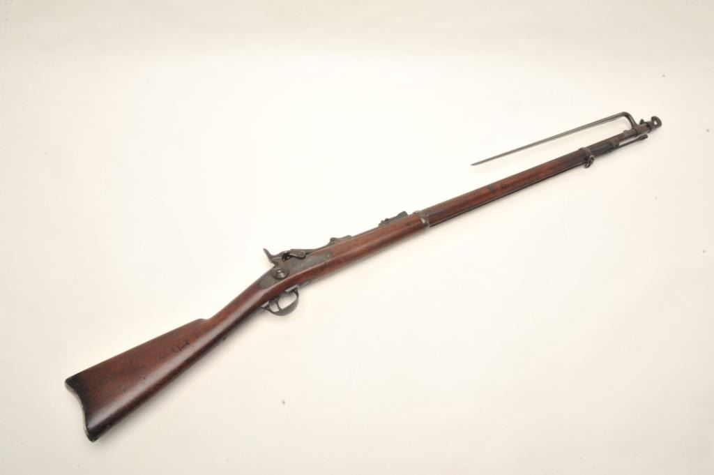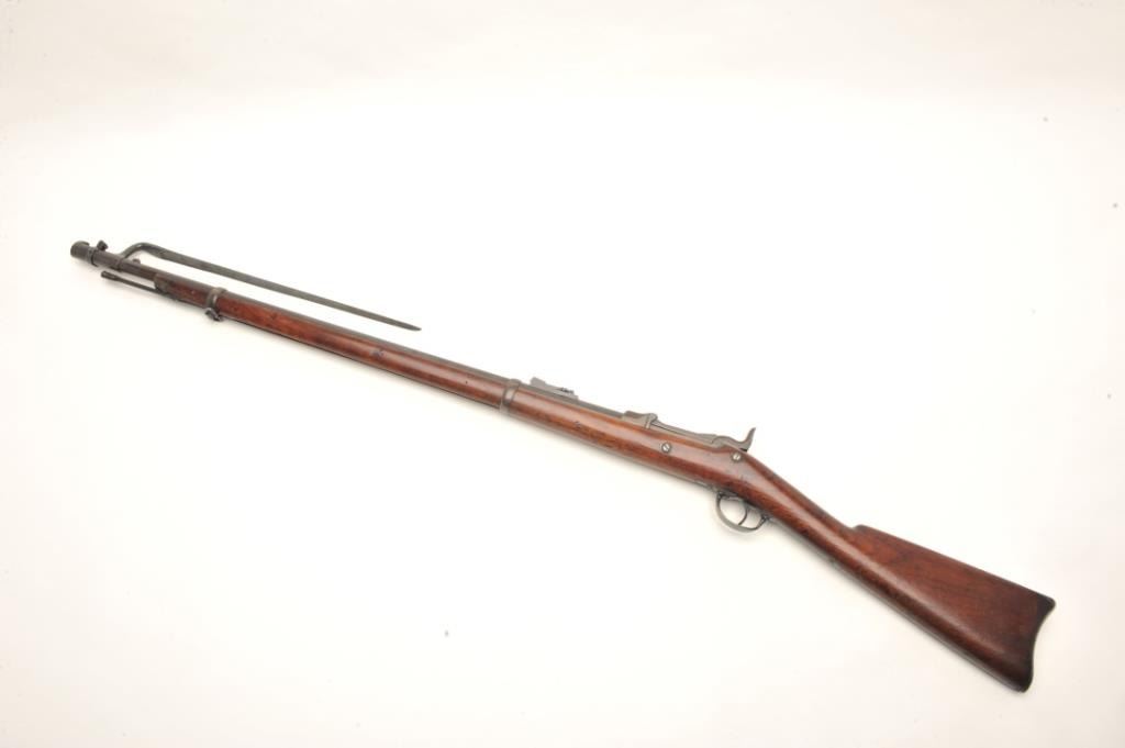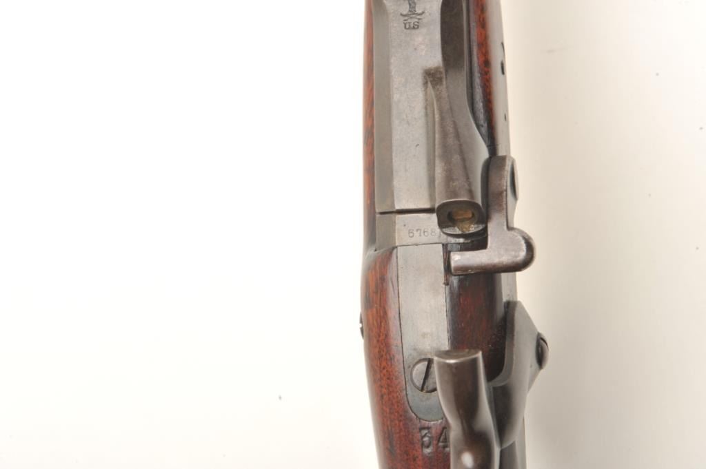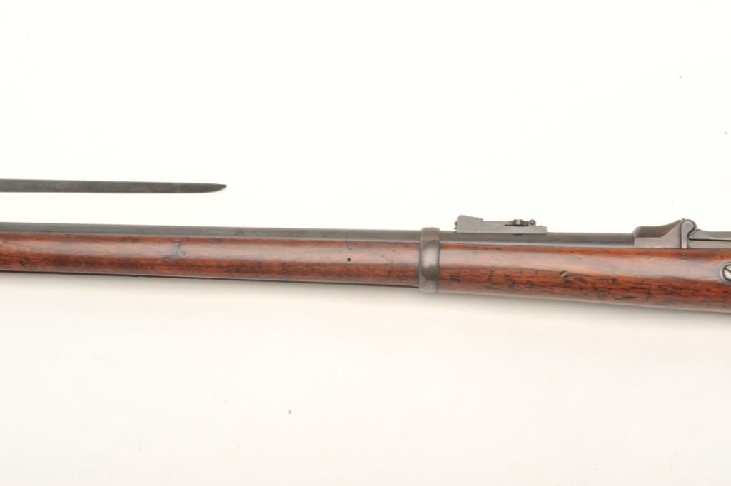 Springfield Model 1873 trapdoor cadet rifle with 2 bands in .45-70 caliber, S/N 57681. Rack or issue #34 stamped in wood behind the tang. In good to very good condition with 50%-70% toning and drifting blue finish going to patina. Good markings, minor spotting and erosion with small and slight areas of pinprick pitting. The stock is also good to very good with minor wear and storage marks. Oval āE.A.ā cartouche and āPā visible.Original and correct bayonet and rod. Good markings. Near excellent and bright bore. (Antique) Est.: $750-$1500