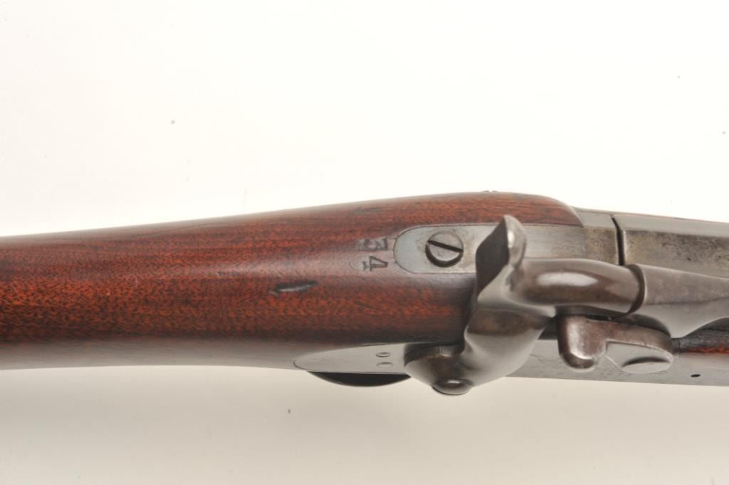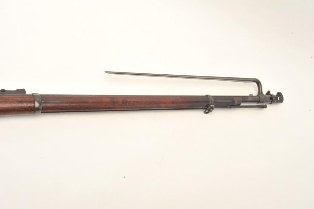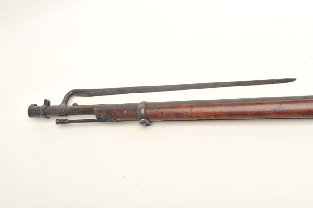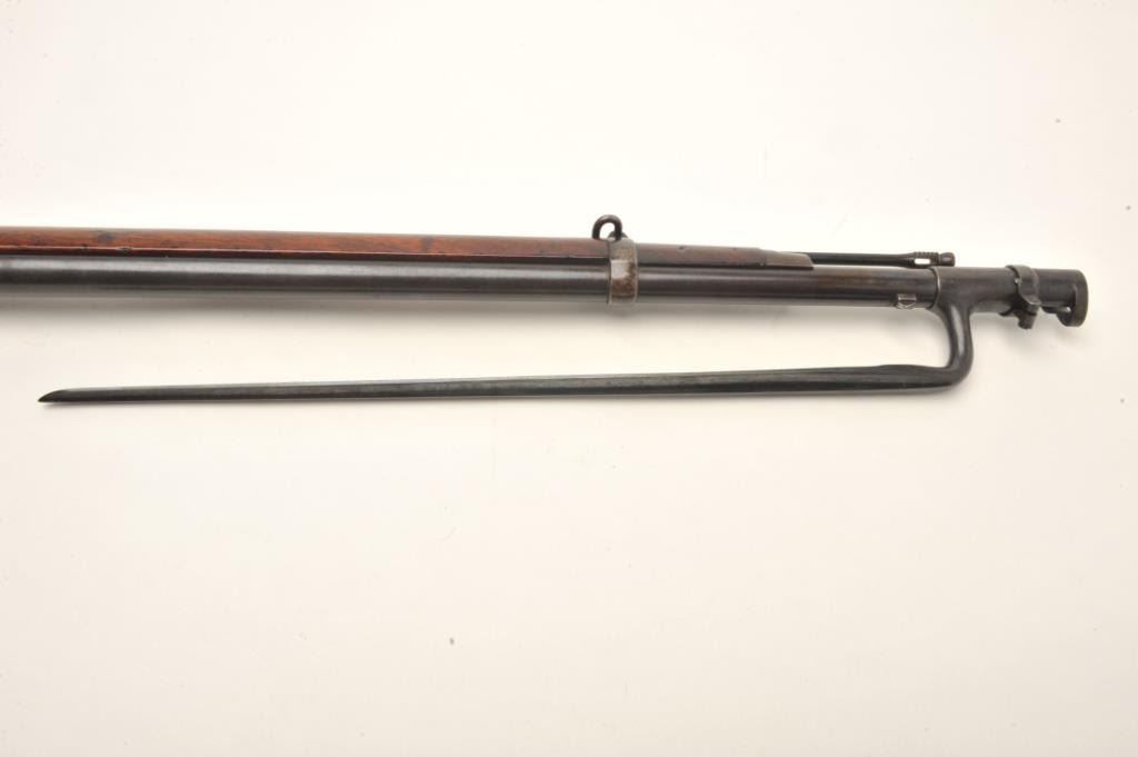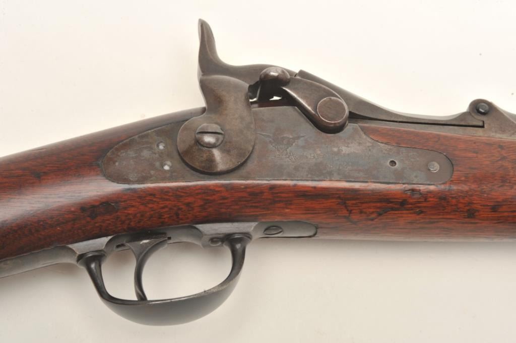 Springfield Model 1873 trapdoor cadet rifle with 2 bands in .45-70 caliber, S/N 57681. Rack or issue #34 stamped in wood behind the tang. In good to very good condition with 50%-70% toning and drifting blue finish going to patina. Good markings, minor spotting and erosion with small and slight areas of pinprick pitting. The stock is also good to very good with minor wear and storage marks. Oval āE.A.ā cartouche and āPā visible.Original and correct bayonet and rod. Good markings. Near excellent and bright bore. (Antique) Est.: $750-$1500