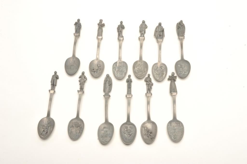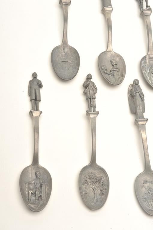Lot 1625 Lot of 12 pewter spoons with figures. Some signed in script. Adolpo Poresdio. Est. $100-$200.