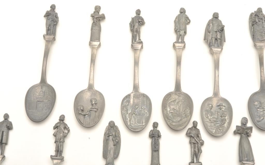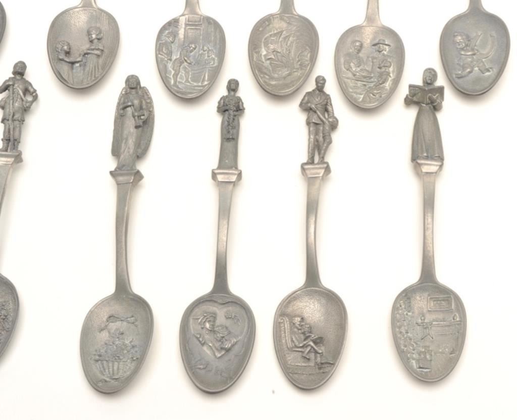 Lot of 12 pewter spoons with figures. Some signed in script. Adolpo Poresdio. Est. $100-$200.