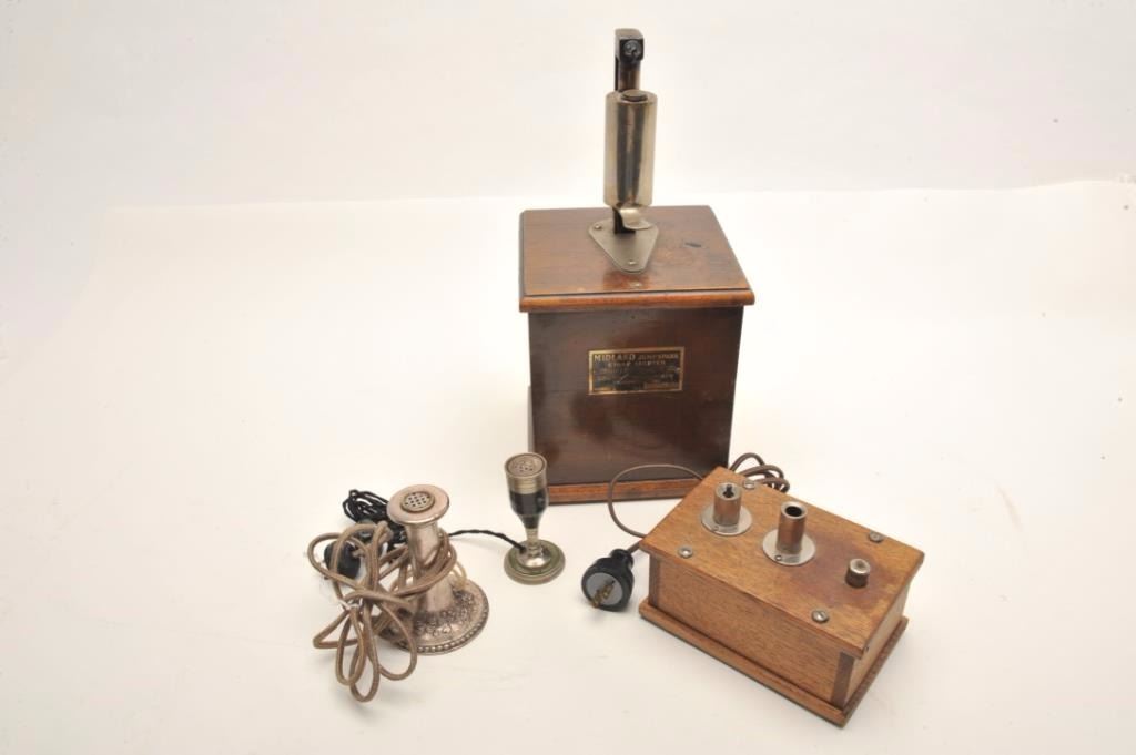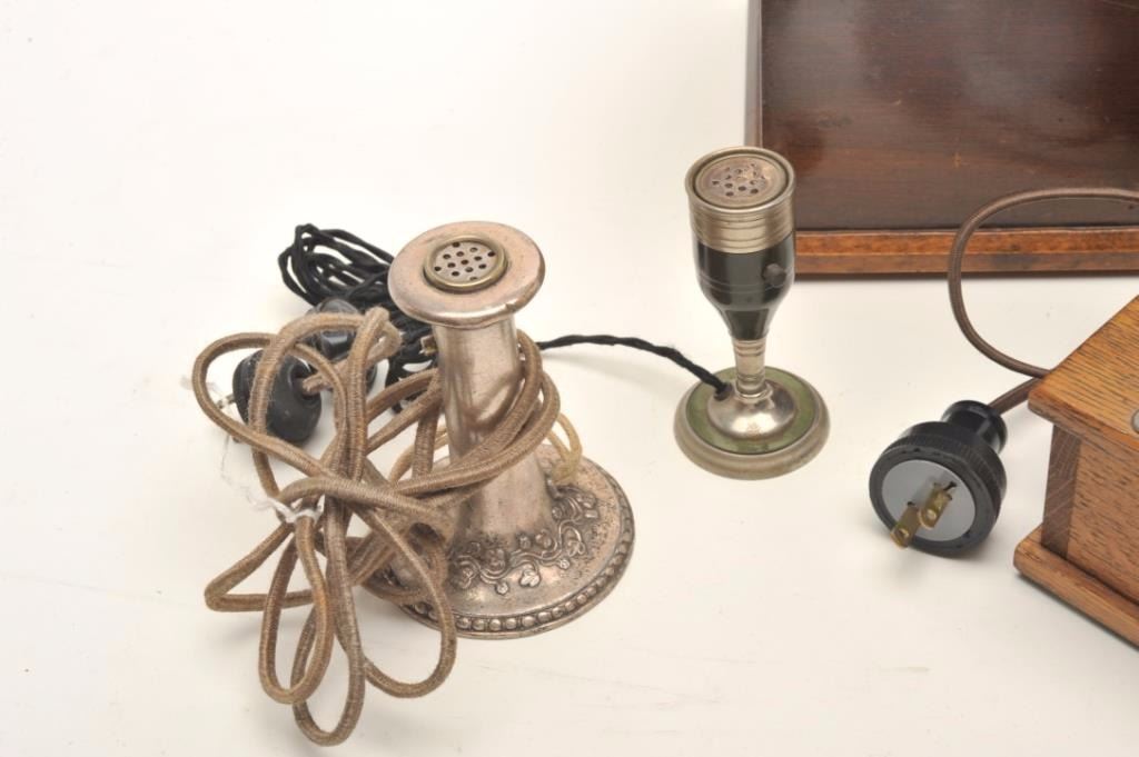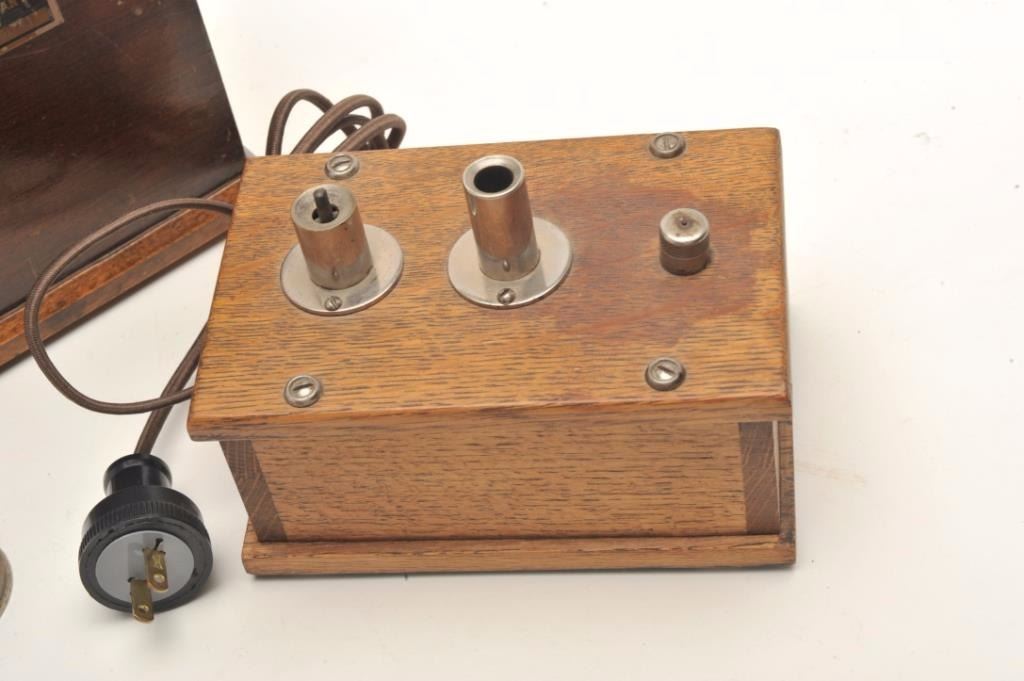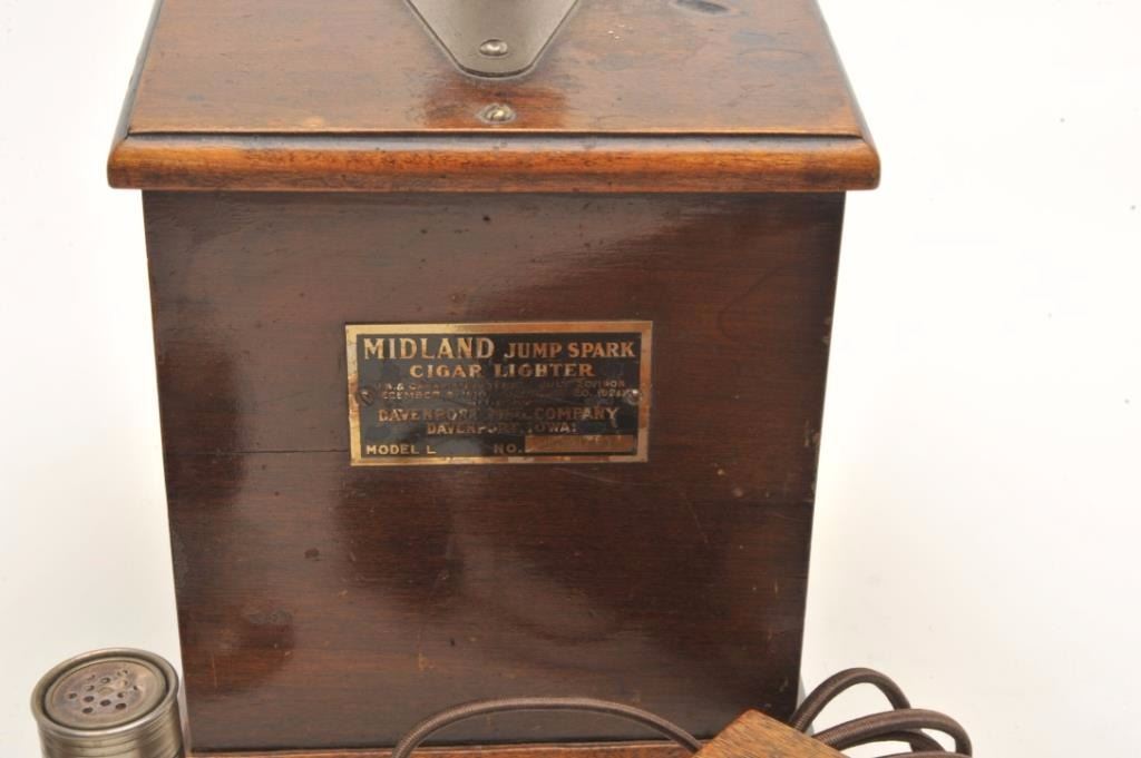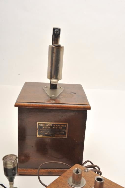 Lot of vintage smoking/tobacco-related items including an electric cigar lighter housed in a wooden box that uses “high test” gasoline for fuel. On the left side of the top is where the gas was filled, the center held the wand and on the far right is the spark housing. Made by Midwest Distributing Co., Denver, CO, ca 1920’s; also a classic large table “Jump Spark” cigar lighter made of wood and metal; this lighter operated onbatteries and fluid and had a wick; made by Midland, ca. 1920; also two electrified “stick” lighters. A neat early grouping! (Reference: James Flanagan’s definitive work “The Big Book of Cigarette Lighters”). Est.: $500-$750.