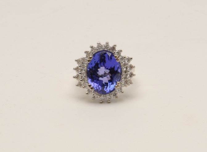 One ladies ring in 14k white gold set with a fine oval tanzanite weighing approx 10 ct and diamonds weighing 1.2ct. Est. $10,000-$15,000.