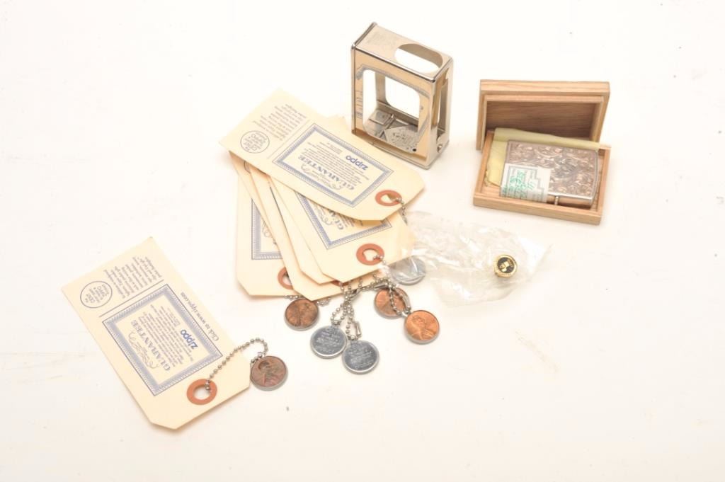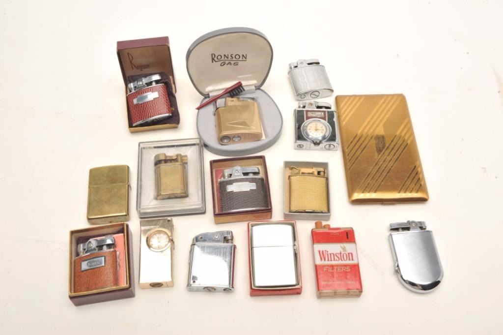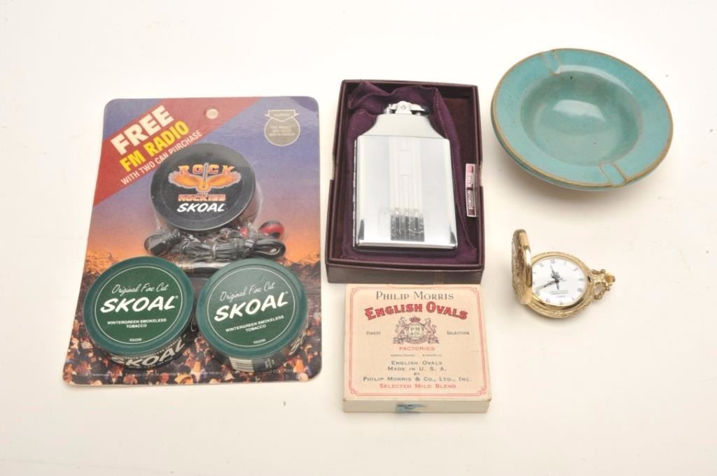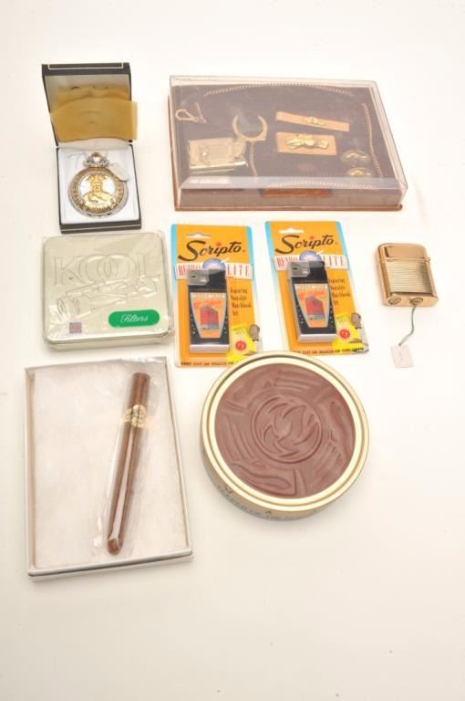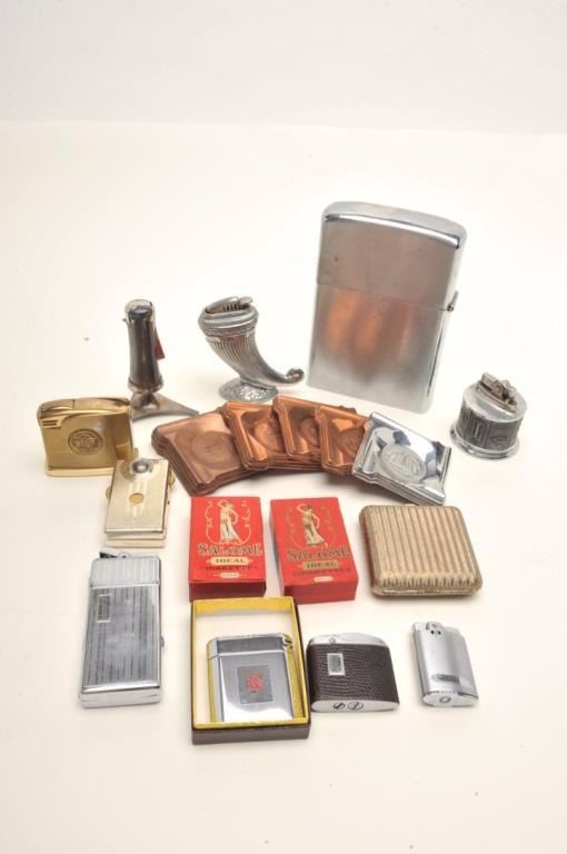 Large lot of misc. vintage cigarette lighters and ashtrays (a number as advertisers); including pocket and tabletop sizes, different makers and models, a “King” Model by Ronson in factory sleeve and cardboard box marked “World’s Greatest Lighter”; a number of the pocket lighters come with their original cardboard boxes. (Reference: James Flanagan’s definitive work “The Big Book of Cigarette Lighters”). Est.:$250-$400.