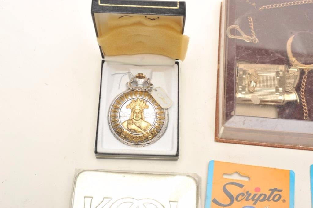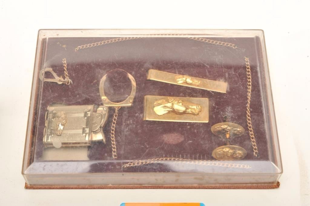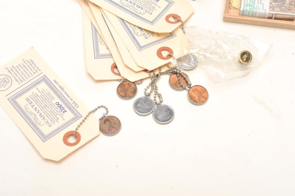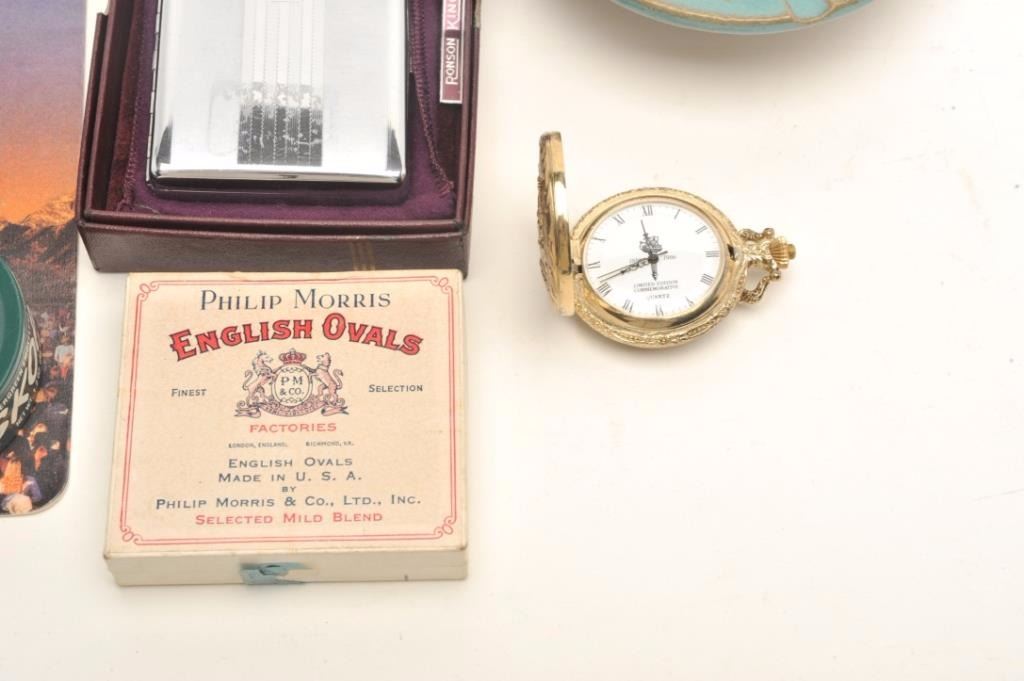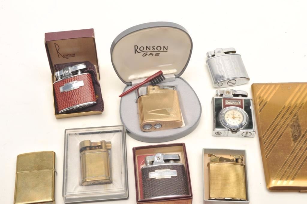 Large lot of misc. vintage cigarette lighters and ashtrays (a number as advertisers); including pocket and tabletop sizes, different makers and models, a “King” Model by Ronson in factory sleeve and cardboard box marked “World’s Greatest Lighter”; a number of the pocket lighters come with their original cardboard boxes. (Reference: James Flanagan’s definitive work “The Big Book of Cigarette Lighters”). Est.:$250-$400.