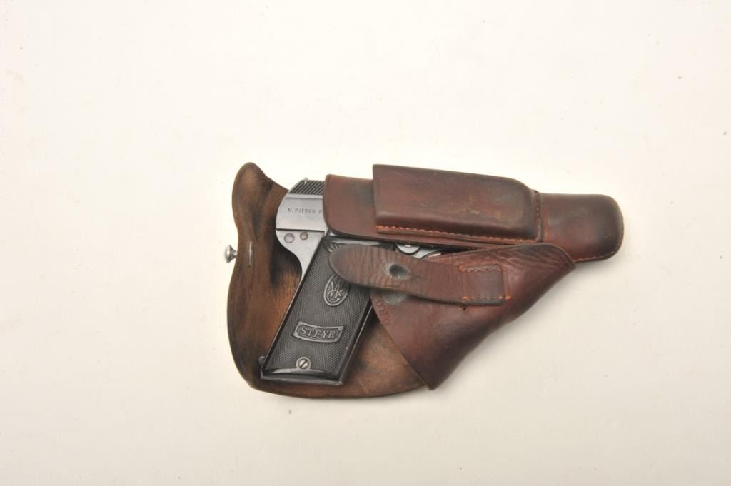 Steyr Semi-Auto pistol in .32 ACP cal. (Pieper’s patent), S/N 11892. In near fine condition. 90%-95% original blue and near fine grips. Military style holster included. Made 1920’s-30’s. (C&R/PPT) Est.: $300-$600