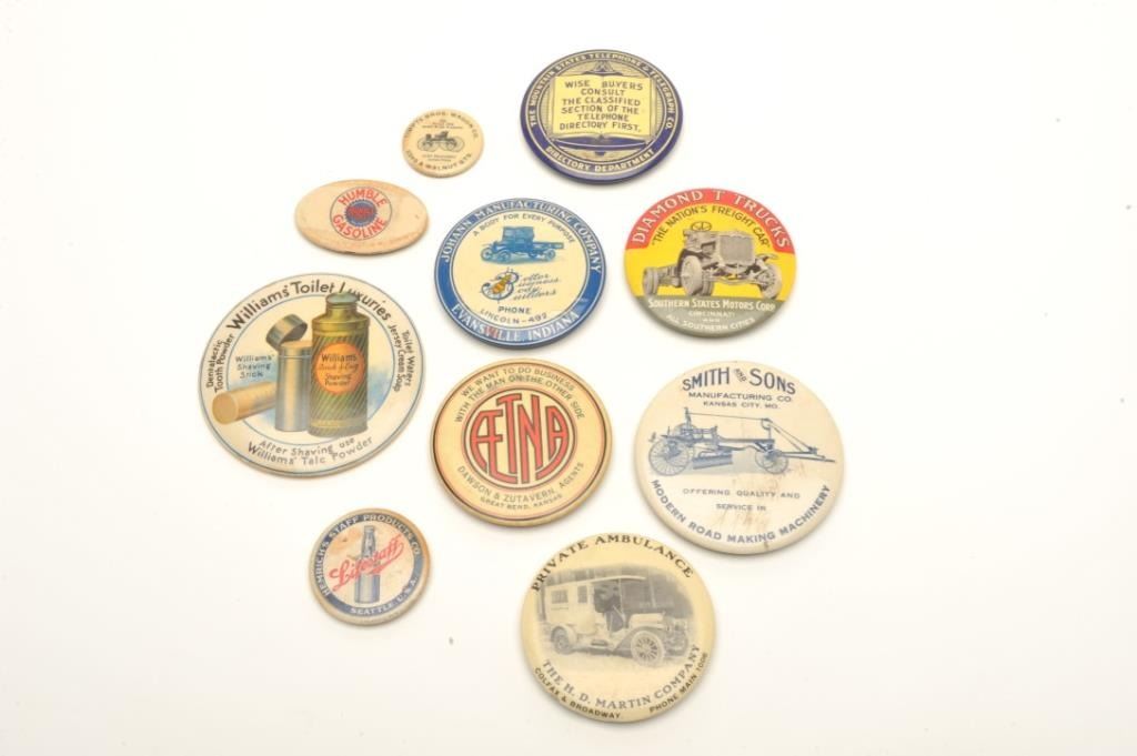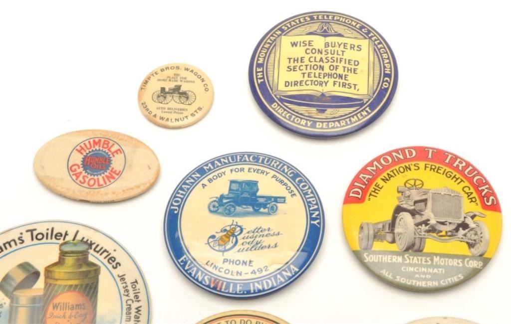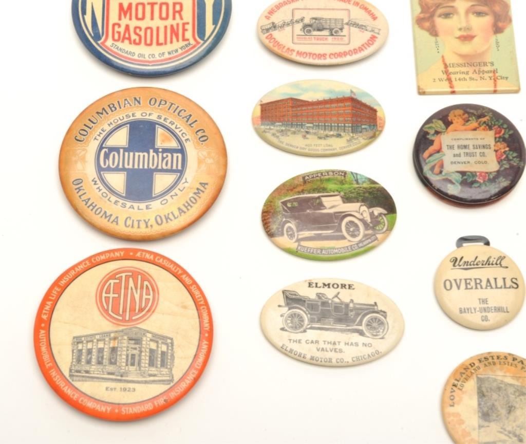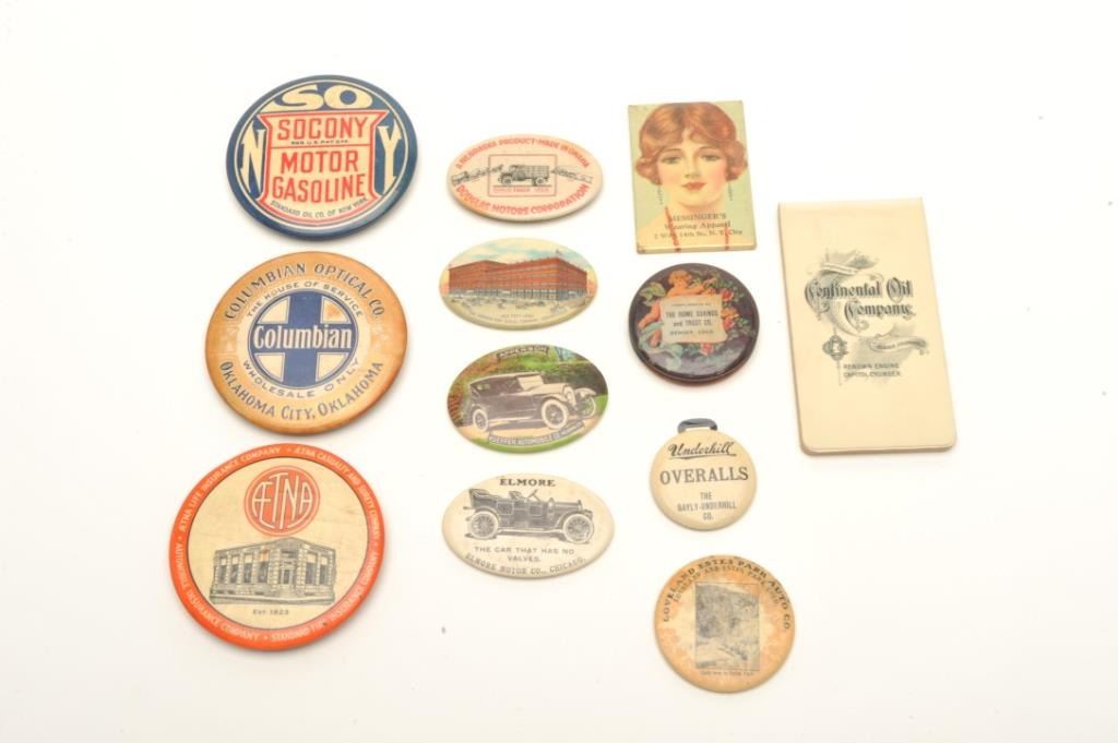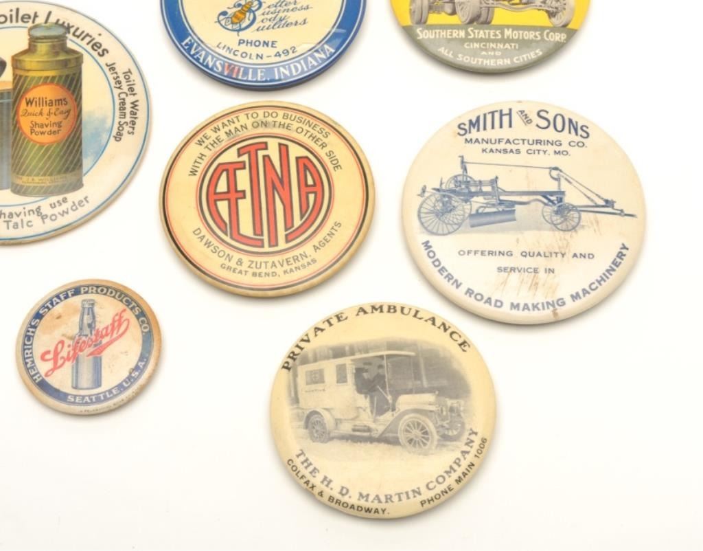 Lot of approximately 28 vintage “give away” advertisers for a variety of products, services and companies; mostly colorful artwork with mirrors on back; several with sharpeners on back; one metal piece and onesmall notepad; most are in at least good to very good condition. Est.: $250-$450.