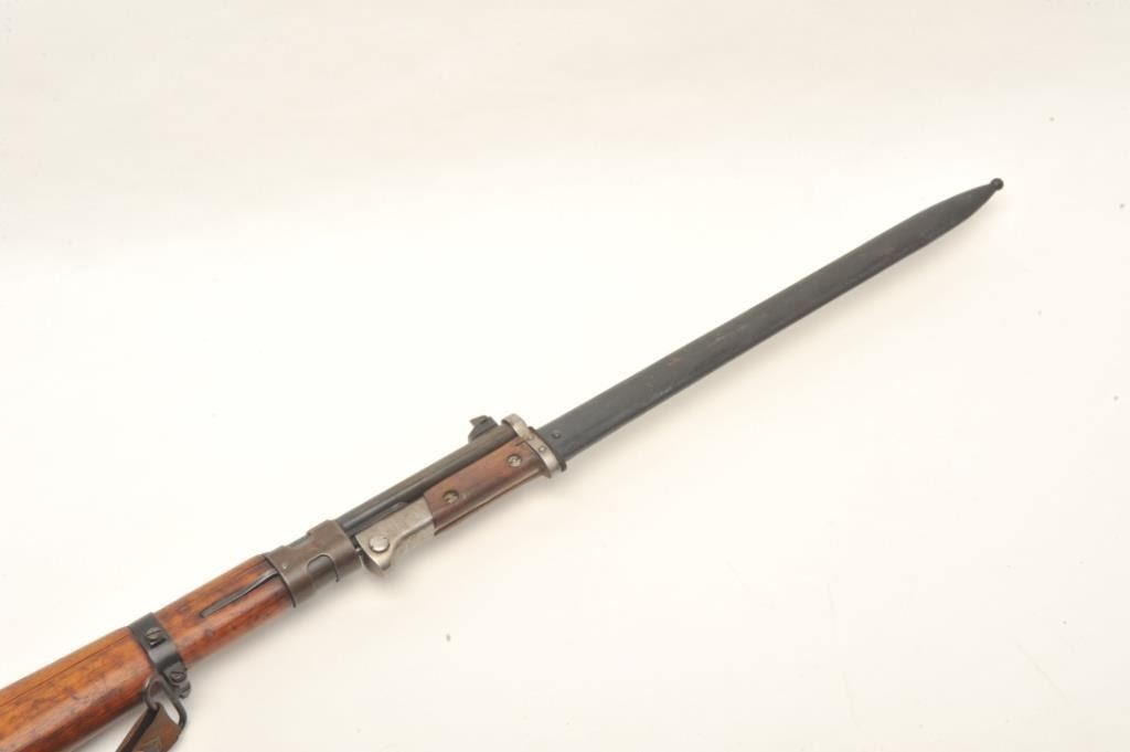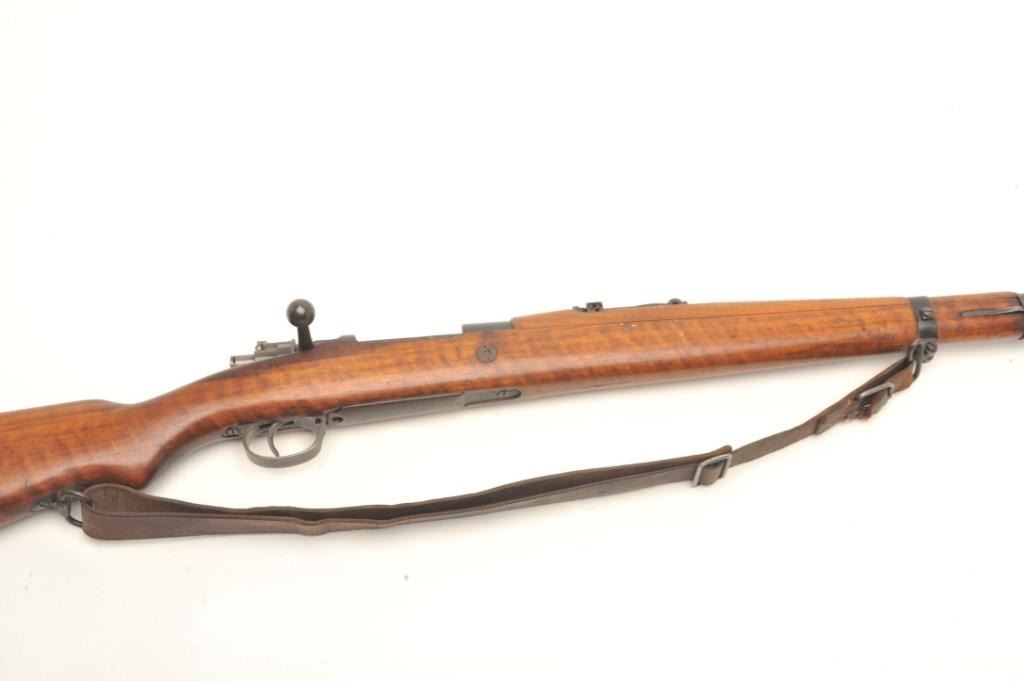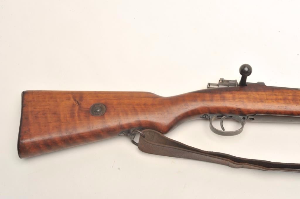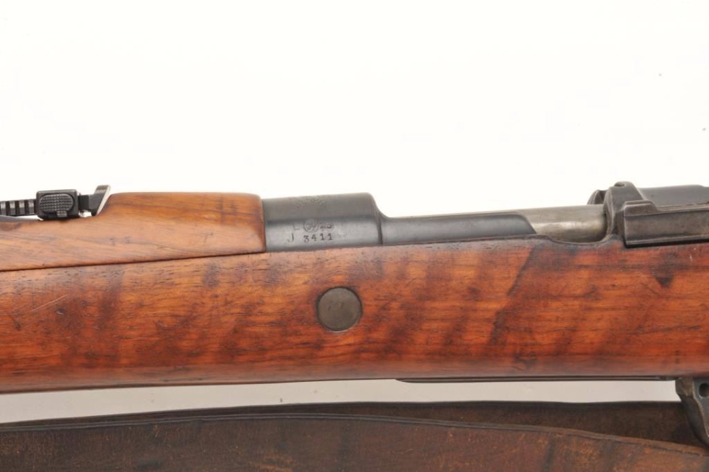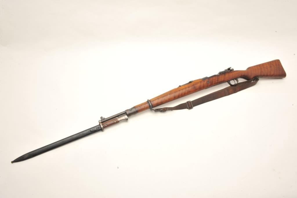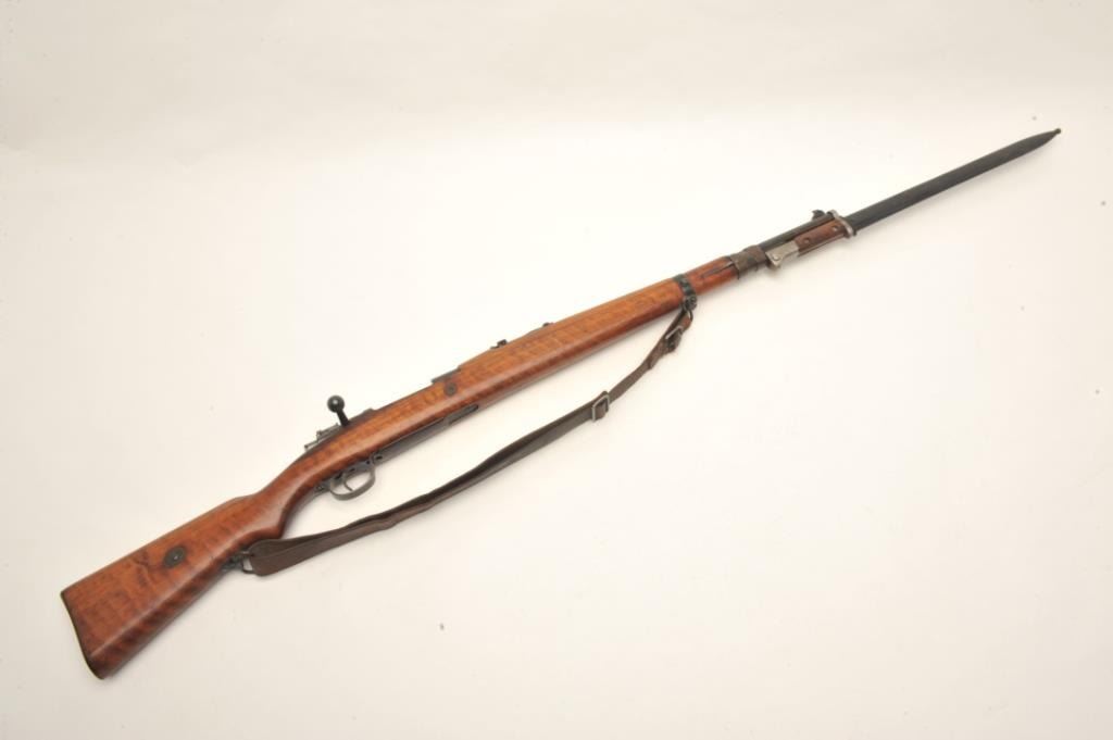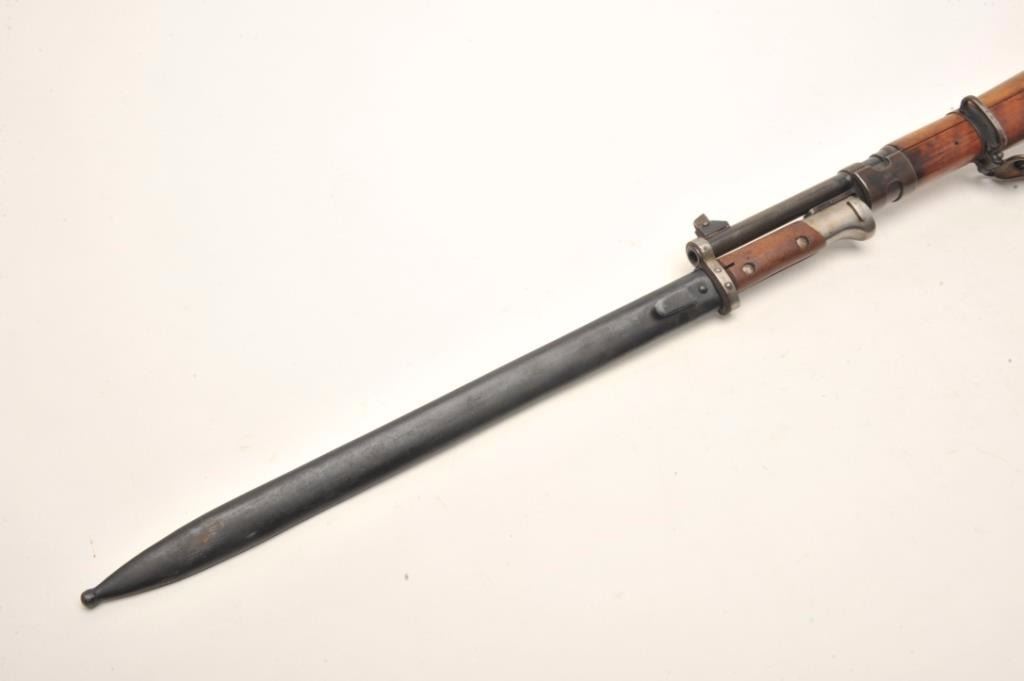 Czech 98 Mauser pre-war in 8 x 57 caliber showing “E-23” proof, S/N 3411 with correct bayonet and scabbard along with matching bolt. In very good plus condition with exceptional stock showing matching numbers.No import marks. Hard to find all original. Possible G.I. bring back. Good bore that may clean to fine. (C&R) Est.: $300-$600