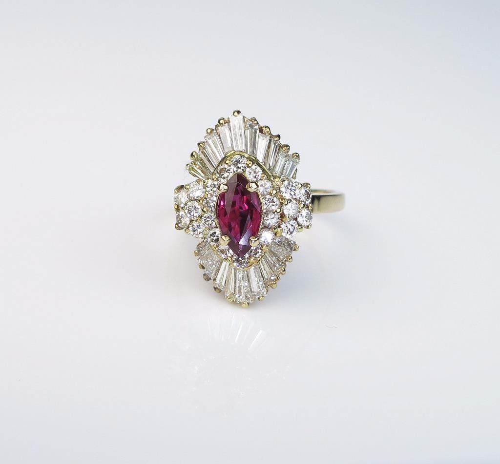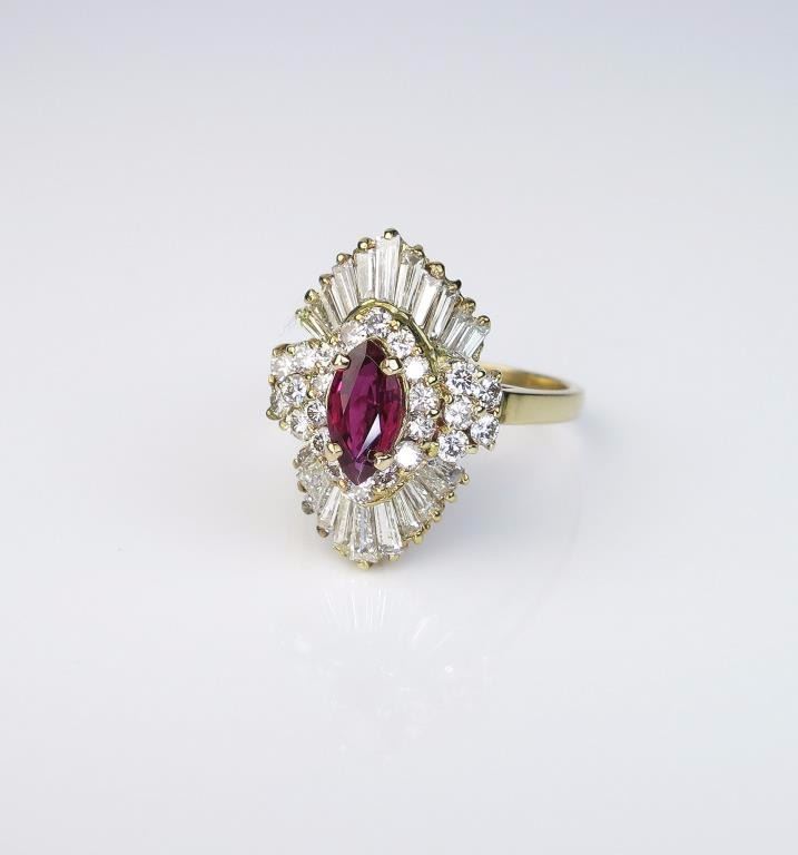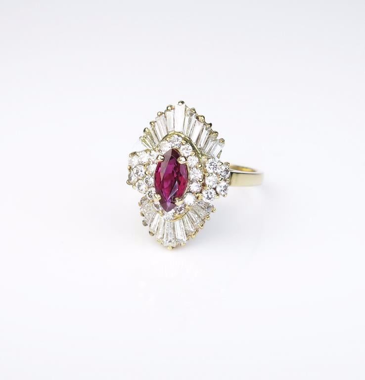 Lot 1678 Opulent Art Deco Style Ruby and Diamond Ring features a marquise cut ruby weighing 1.34 carats wit