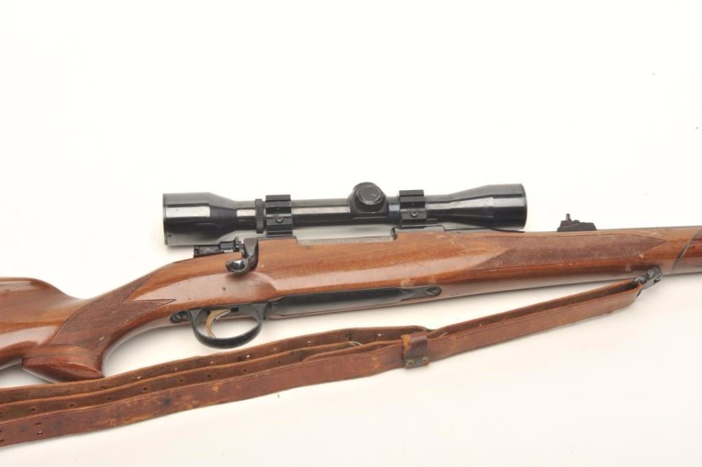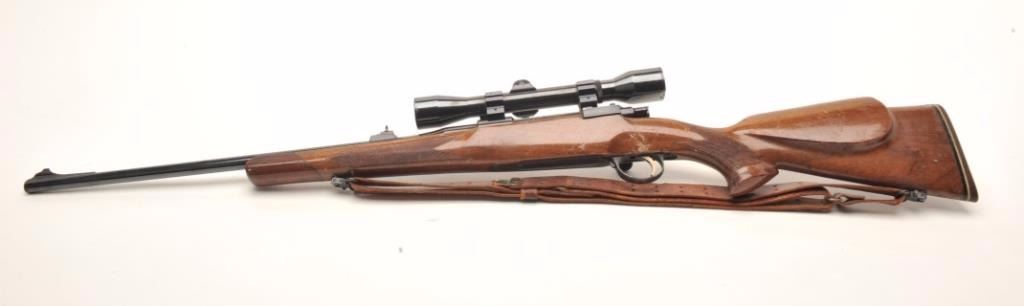 H & R Ultra bolt action rifle, .243 Winchester caliber, serial #55301. The rifle is in good overall condition with a 22” barrel. The barrel and receiver retain the majority of their blued finish with lightsurface erosion and small mars to the finish noted. The rifle features a high quality FN Mauser action. The checkered wood stock is in fair overall condition showing heavy use with numerous small dents, scrapes andcompressions. The butt ends with a rubber, H & R marked butt pad. The bore is good, the action crisp and markings are sharp on this desirable FN Mauser sporter. The rifle is topped with a Micro Trac fixed power scopeand includes sling swivels and leather, military style sling. Est.: $200-$400. (Modern).