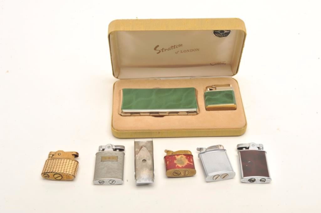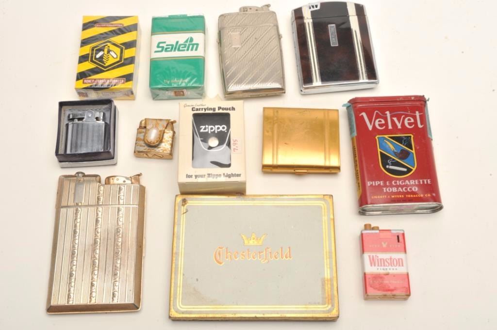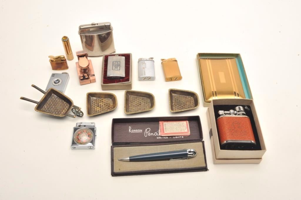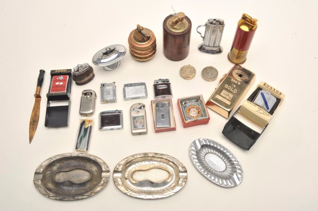 Lot 1699 Large lot of vintage pocket lighters and other older smoking accessories including a desktop light