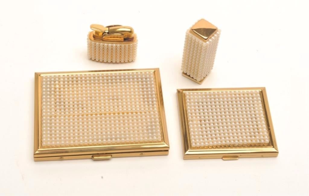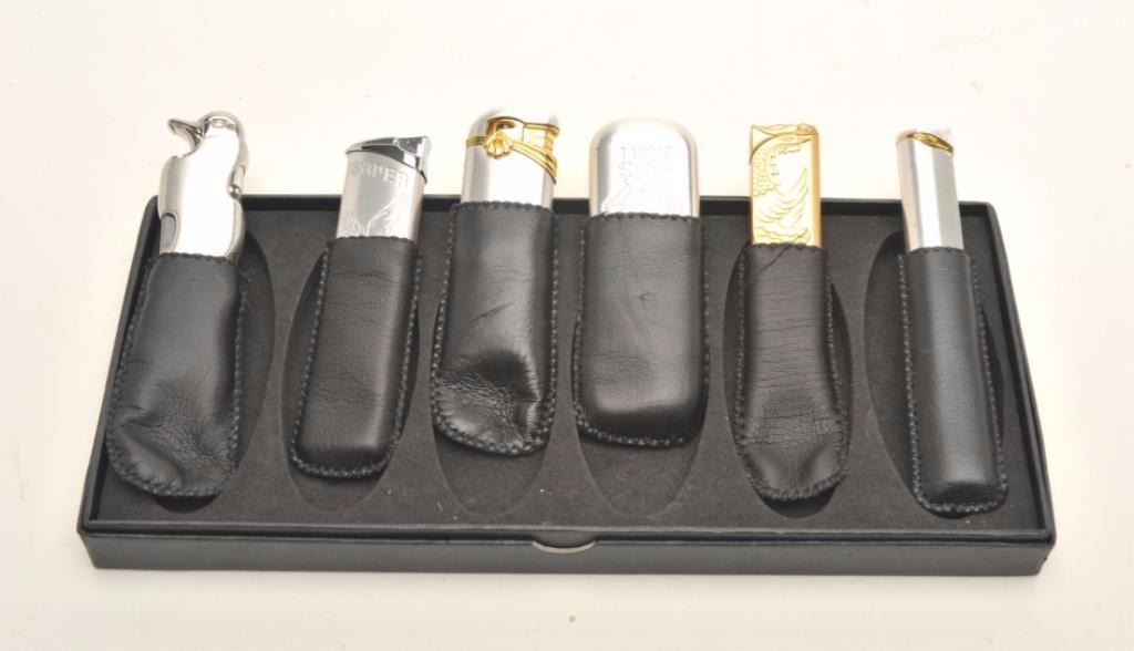 Large lot of vintage pocket lighters and other older smoking accessories including a desktop lighter in the shape of a shotgun shell; a leather covered table lighter; another table lighter in the form of a GoldBar; a lighter and cigarette carry case ensemble in factory box by Stratton of London; several ashtrays and a great variety of pocket lighters, some in their original boxes! (Reference: James Flanagan’sdefinitive work “The Big Book of Cigarette Lighters”). Est.: $250-$400.