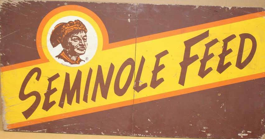 Lot 1714 Large fiberboard painted sign advertising “SEMINOLE FEED”, approximately 24” x 48” in overall goo