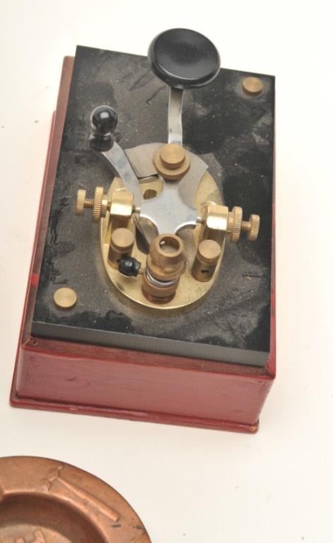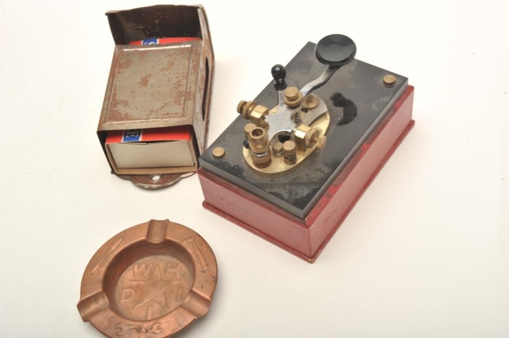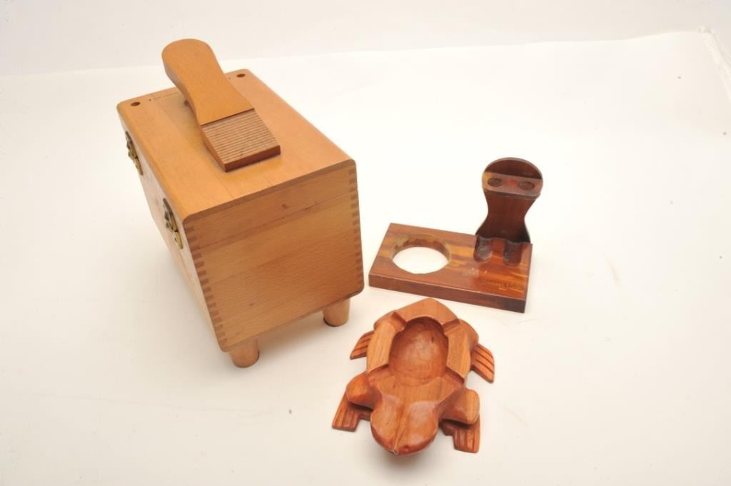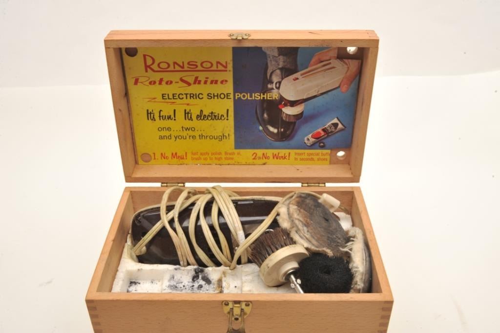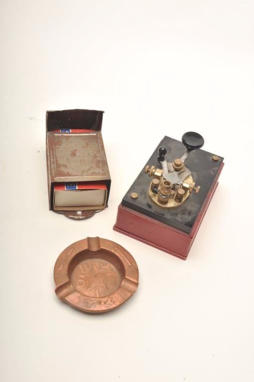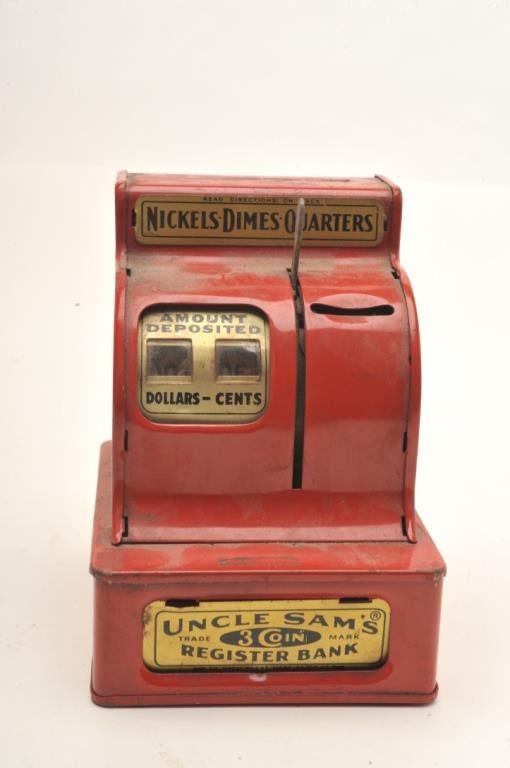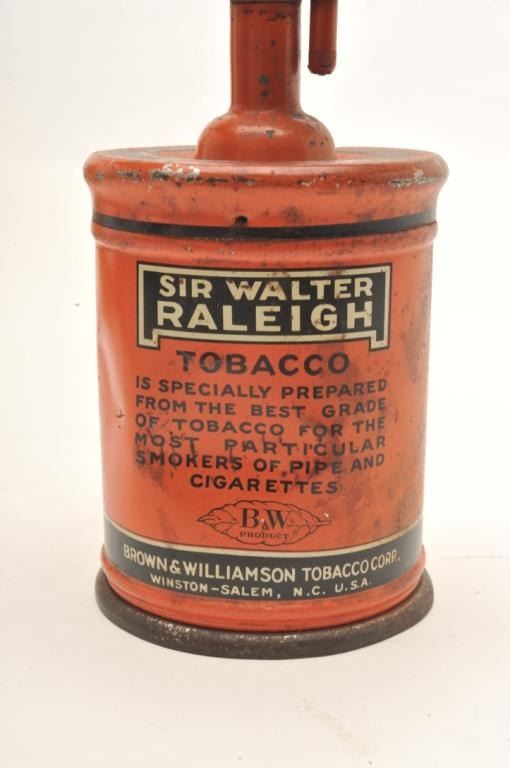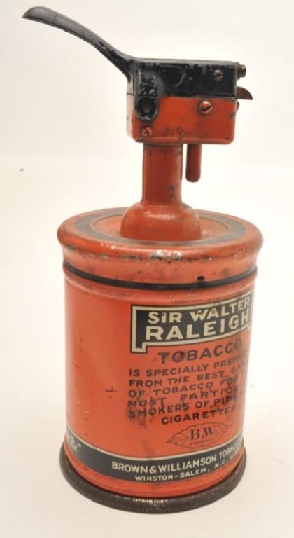 Lot of vintage and collectible tobacco-related items including an unusual Ronson brand electric shoe polisher in wooden shoe box; a Sir Walter Raleigh metal tabletop size lighter; a metal cigarettecanister; an Eagle brand porcelain cigar lighter in original factory cardboard box; misc. sizes of lighters; some advertisers, several ashtrays including one with a painted “Phillip Morris caller figure. Also an oldmetal red painted Uncle Sam’s Register Bank. (Reference: James Flanagan’s definitive work “The Big Book of Cigarette Lighters”). Est.: $250-$400.