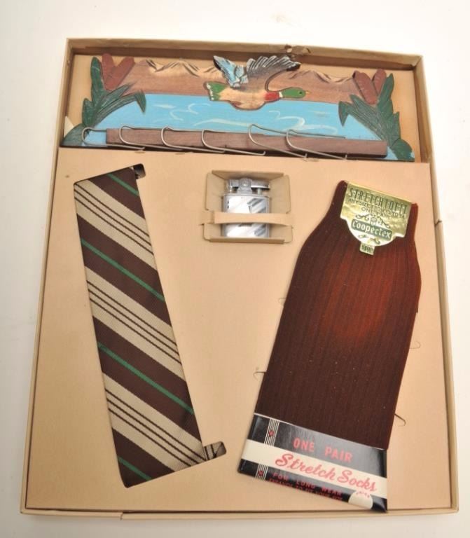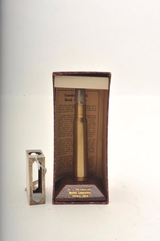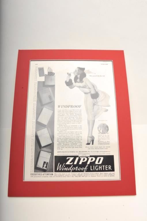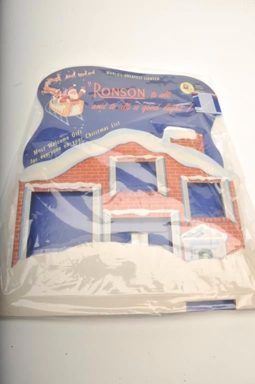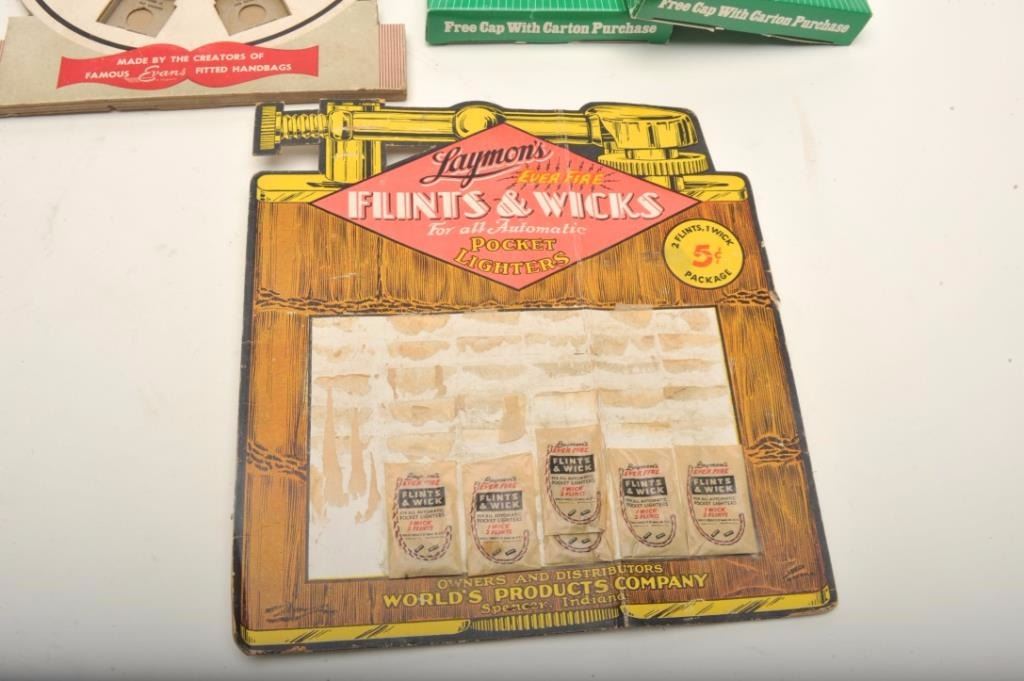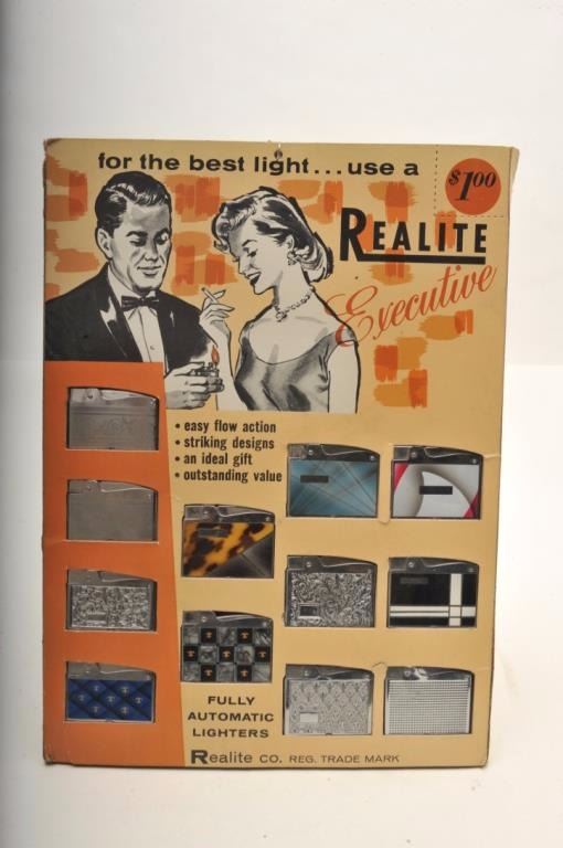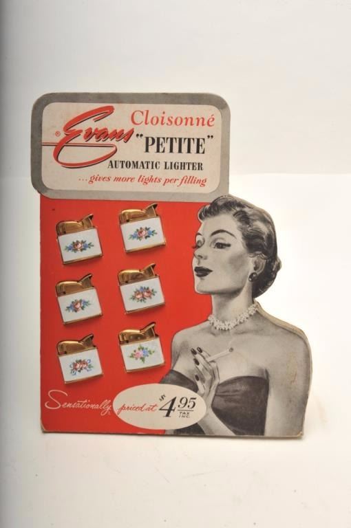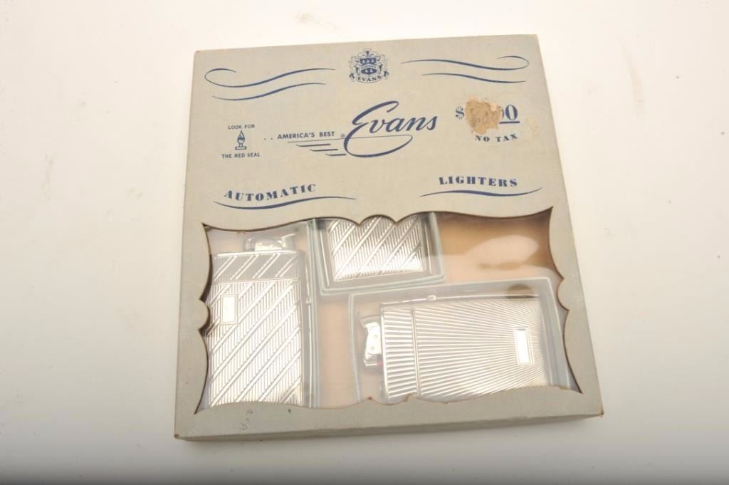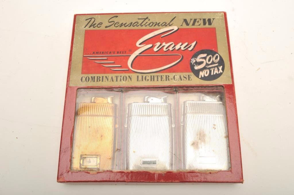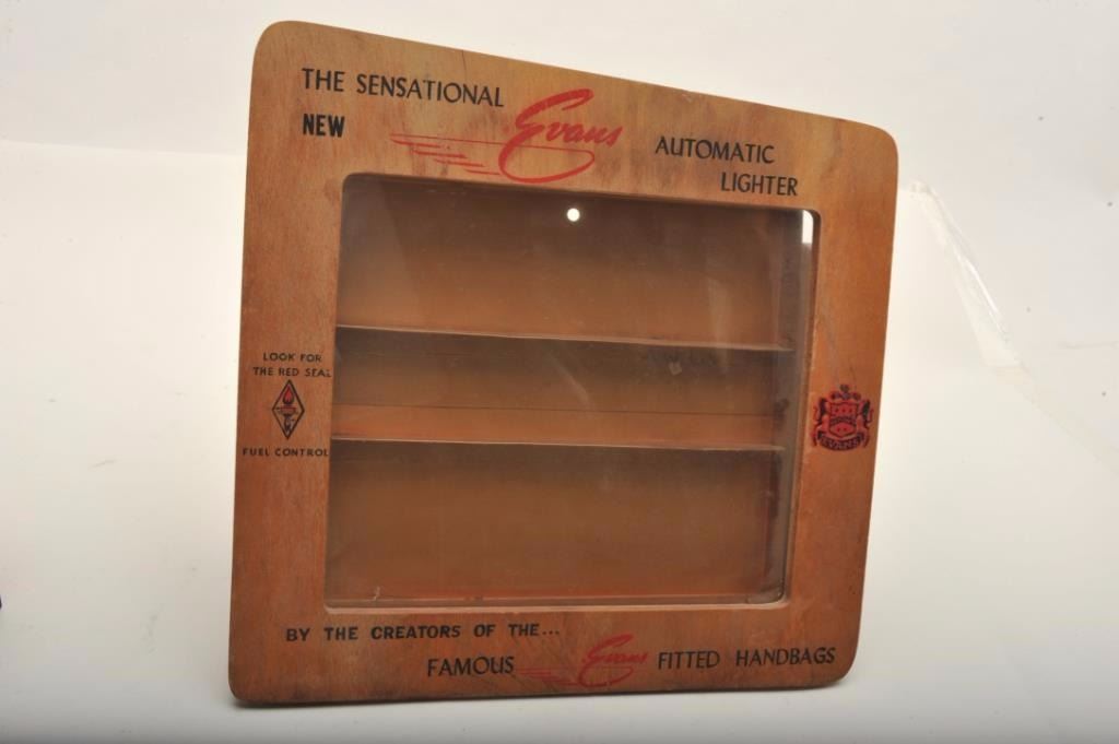 Bonanza lot of vintage tobacco related accessories including an Evans Automatic Lighter store display wood showcase, approximately 14” x 14”; a copy of Zippo lighter’s WW II; A remembrance leathercovered book; 4 Ronson repair-a-lite system parts in booklet-type containers; a store countertop display of 12 different Realite Executive lighters; an Evans Cloisonne Petite store display of 6 lighters; several othermisc. display cards (without products) and two additional Evans brand displays with combination lighter-cases. (Reference: James Flanagan’s definitive work “The Big Book of Cigarette Lighters”). Est.:$500-$750.