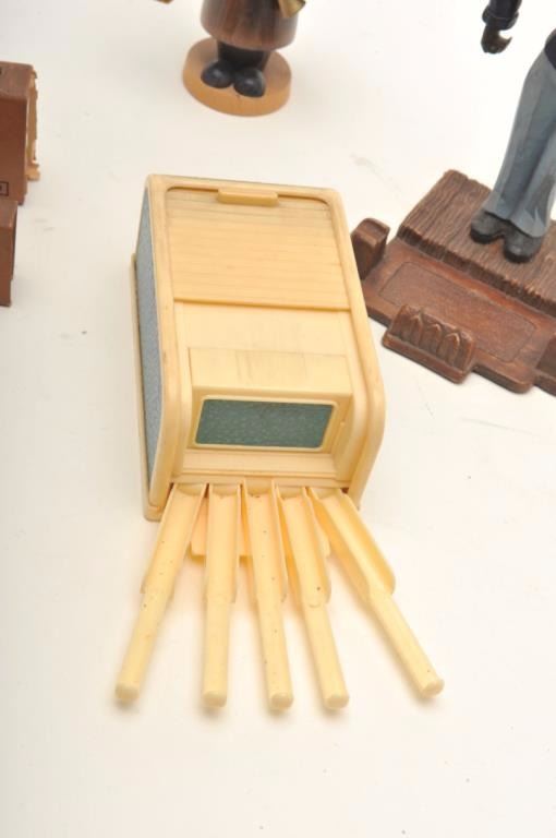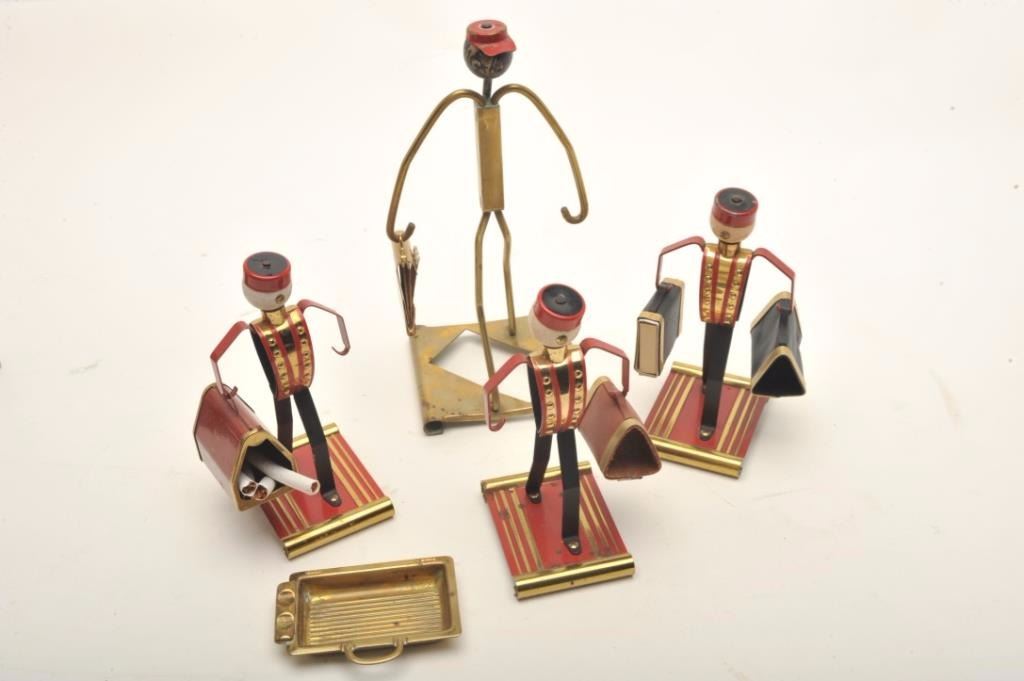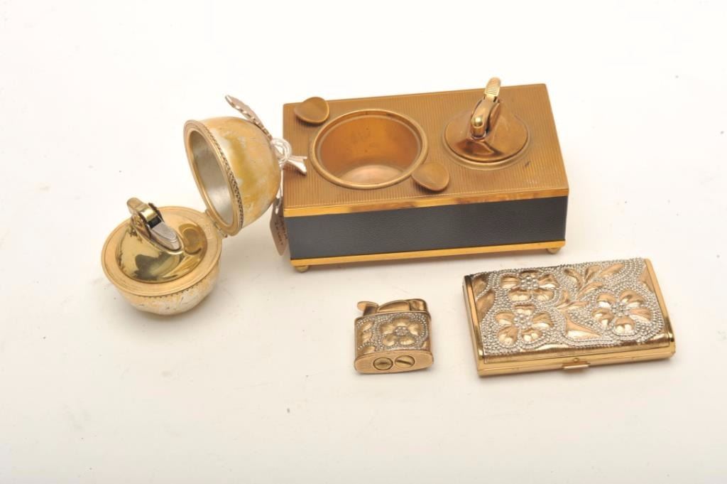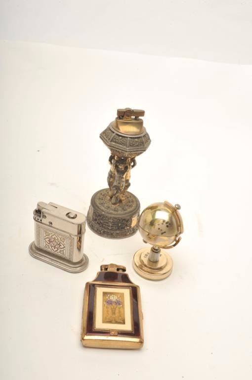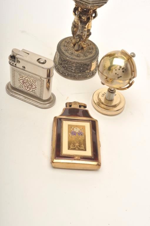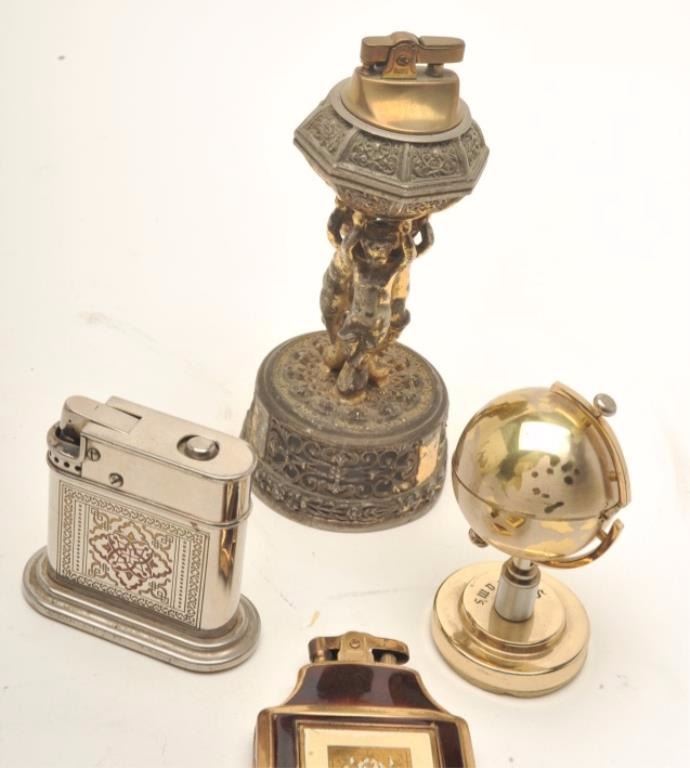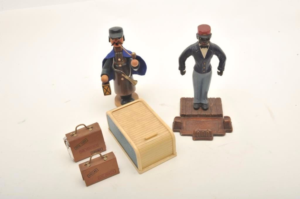 Lot of misc. vintage collectible tobacco-related accessories including a plastic roll top cigarette dispenser with leather on the sides, made by Rolinx in England, ca. 1952; a ceramic red cap trainporter with luggage holding cigarettes and boxed matches with ashtray at the base, ca. 1930’s; 2 desk lighters in the shape and detail of stock market ticker tapes; plus a variety of other desk lighters, cigarettecarriers, ashtrays, etc. (Reference: James Flanagan’s definitive work “The Big Book of Cigarette Lighters”). Est.: $250-$400.