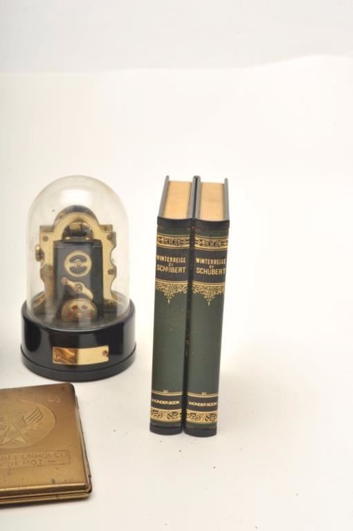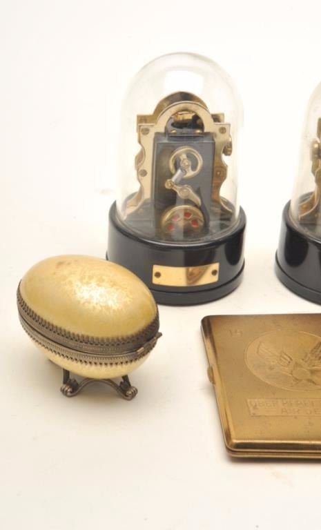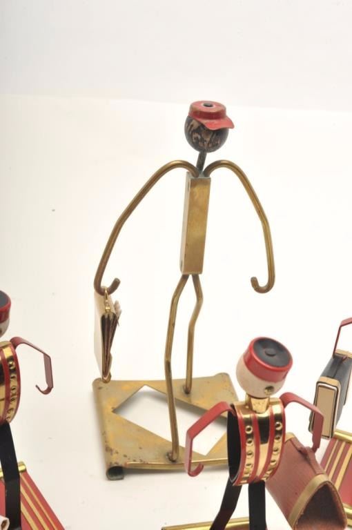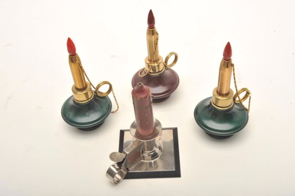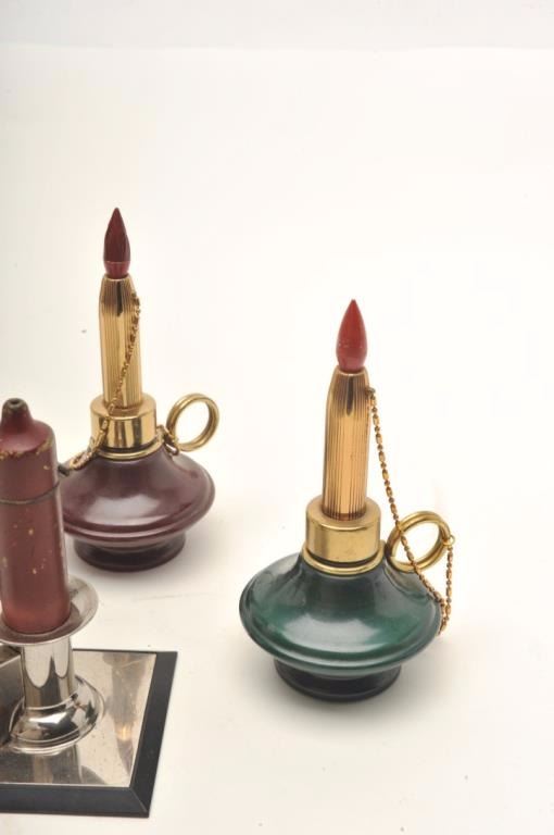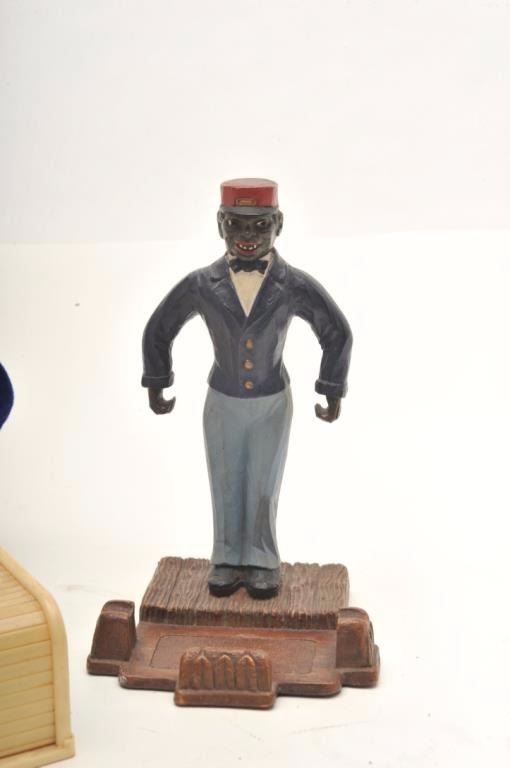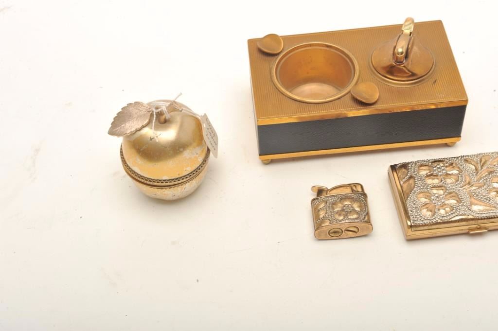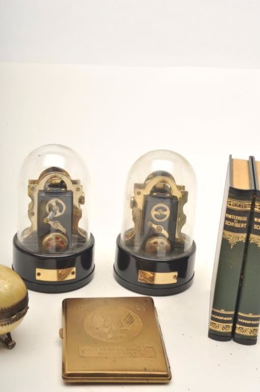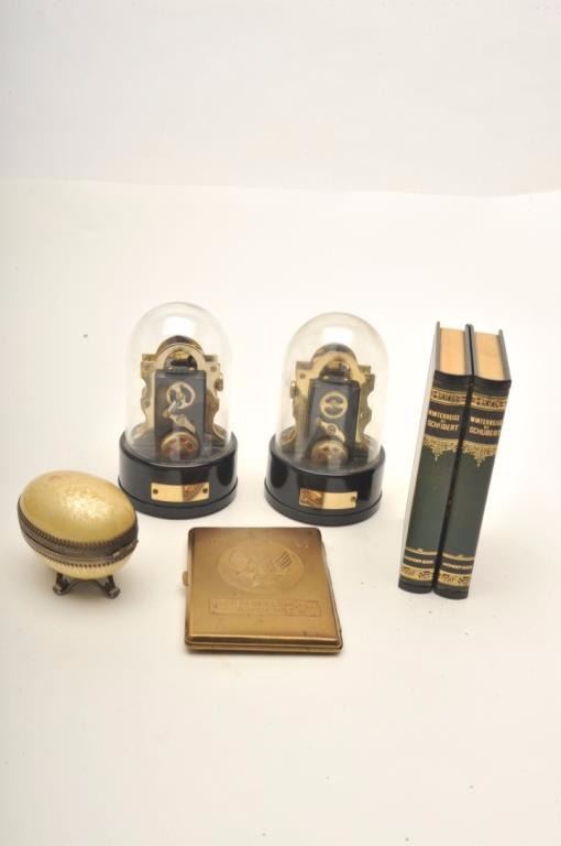Lot of misc. vintage collectible tobacco-related accessories including a plastic roll top cigarette dispenser with leather on the sides, made by Rolinx in England, ca. 1952; a ceramic red cap trainporter with luggage holding cigarettes and boxed matches with ashtray at the base, ca. 1930’s; 2 desk lighters in the shape and detail of stock market ticker tapes; plus a variety of other desk lighters, cigarettecarriers, ashtrays, etc. (Reference: James Flanagan’s definitive work “The Big Book of Cigarette Lighters”). Est.: $250-$400.