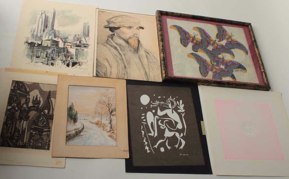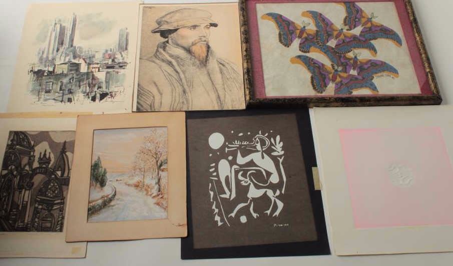 Lot of artwork; butterflies signed “Carbone Lurie 89”, 10” x 12” watercolor, gouache, mixed media; 5 small prints of various subjects and age. Est.: $100-$200.