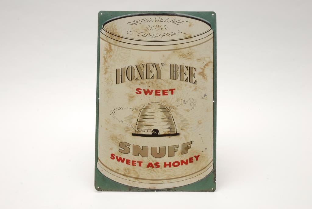 Lot 1781 Honey Bee Snuff advertiser tin sign in good condition. Measures 17 ½” x 11 ½”. Rust at the ends fr