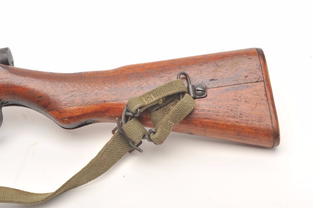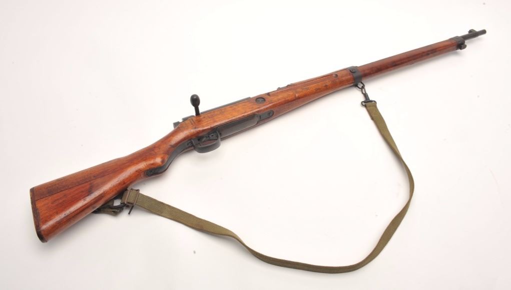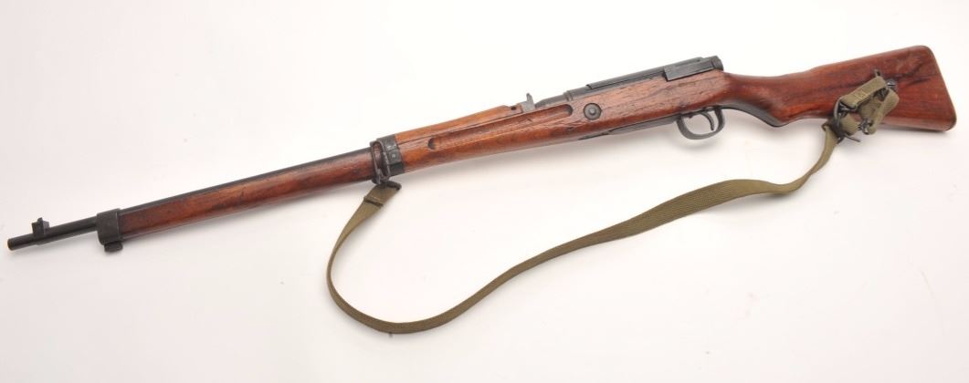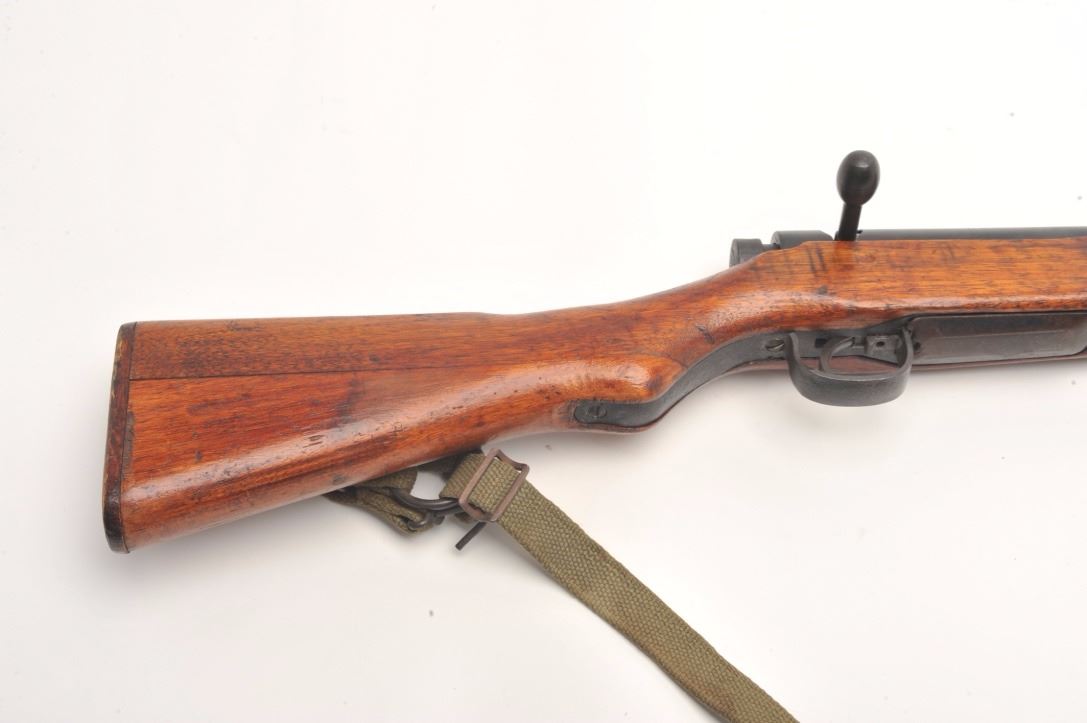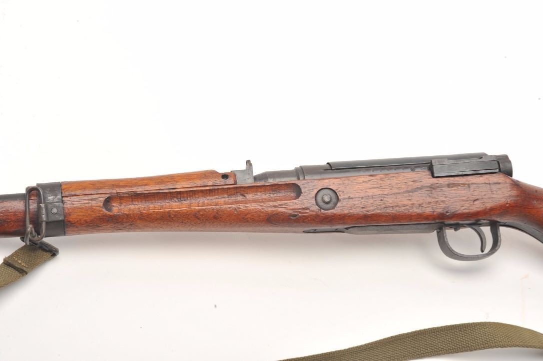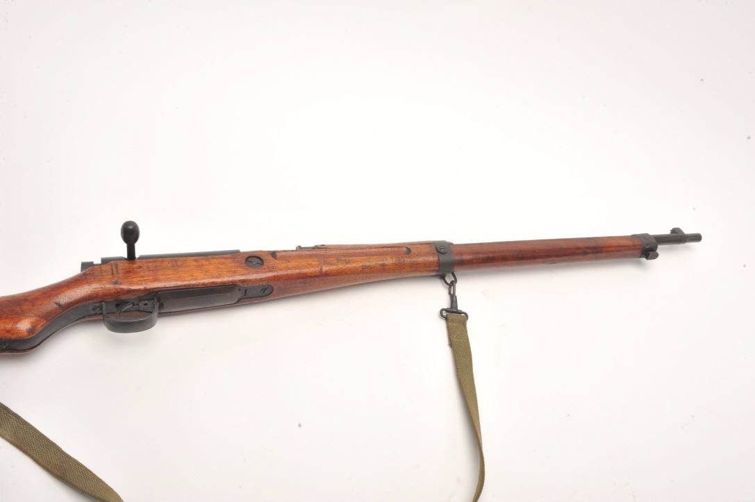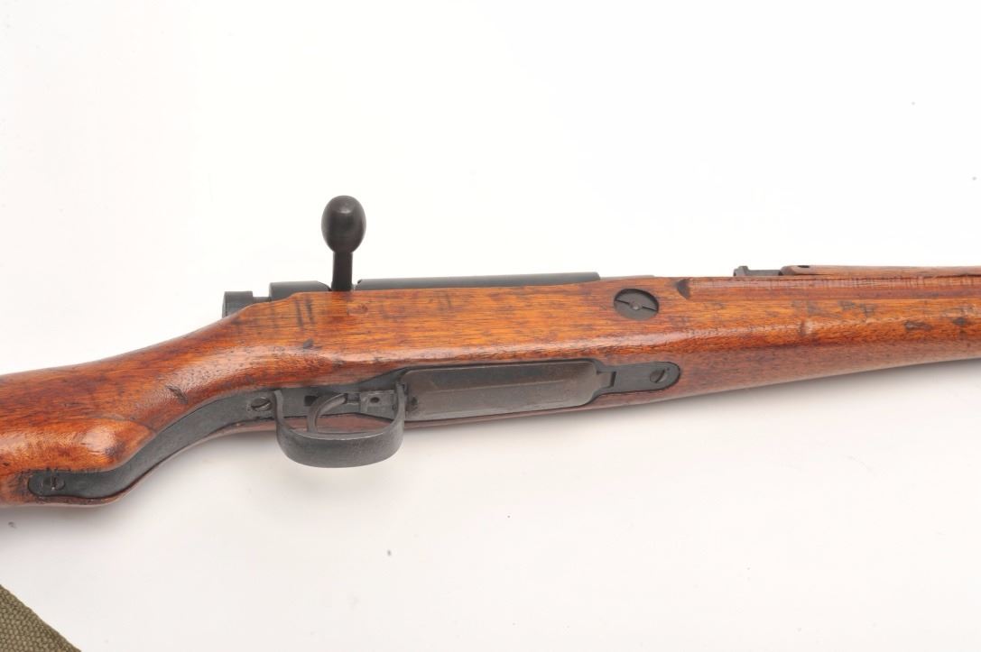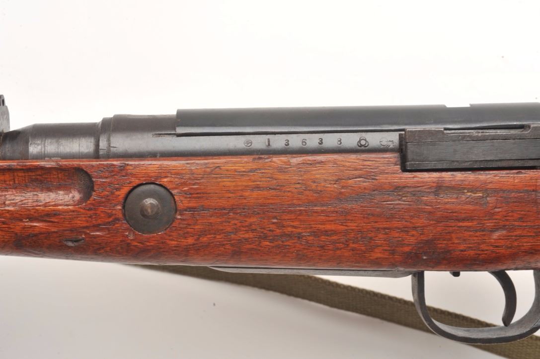 Arisaka Model T-99 Last Ditch rifle, 7.7 mm, serial #13638. The rifle is in good overall condition with a 26” barrel. The barrel and receiver retain the majority of their blued finish with light to moderate surface rust,particularly on the magazine base. The Mum has been ground off the front ring of the receiver. The smooth wood stock is in good condition with mars and compressions consistent with service use. The butt stockhas slings swivels and a canvas sling added. The bore is good, the action functions and the markings are legible. Est.: $250-$500. (C+R).
