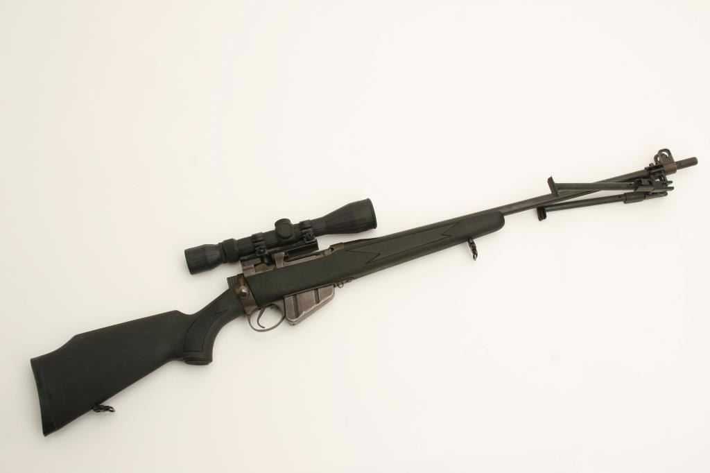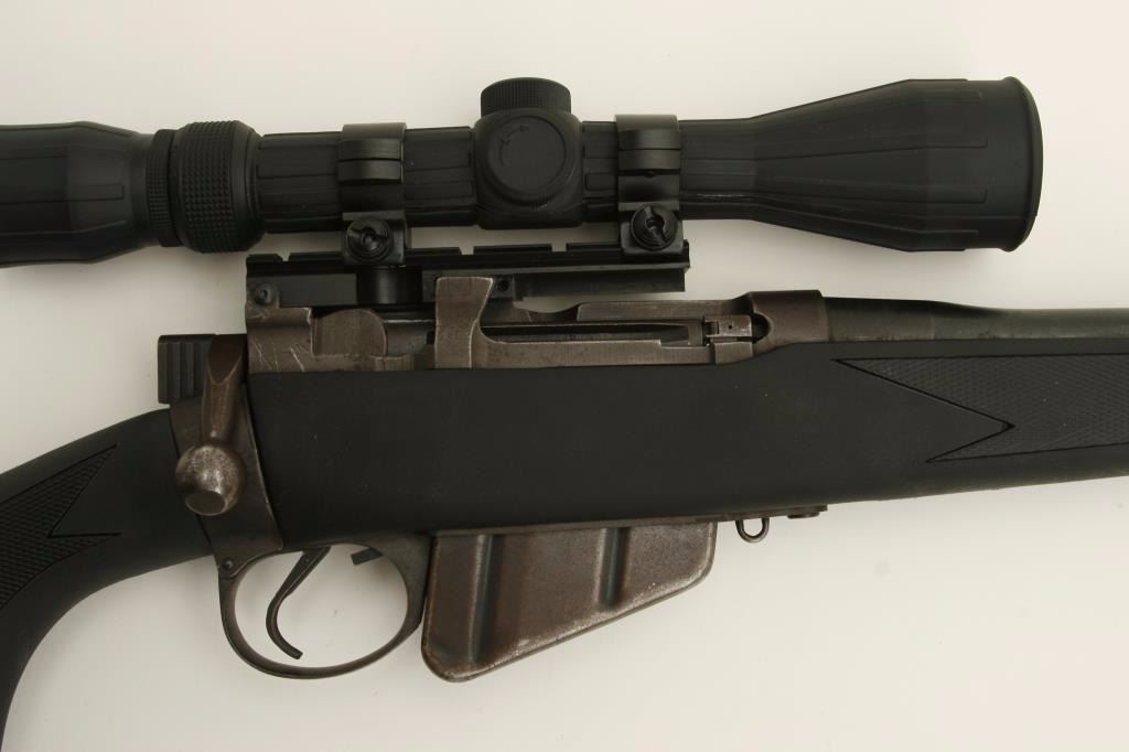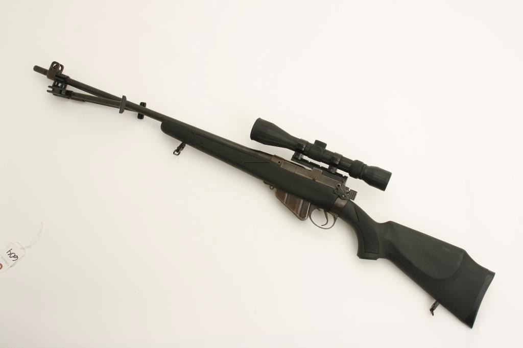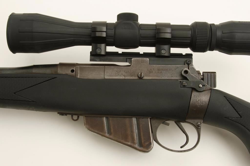 Sporterized Enfield No. 4 MK I bolt action rifle, “U.S. Property” marked, approximately .30 caliber, 25.5” barrel, with later bipod, restocked with composite modern half stock, S/N 38C3886, import marked .303 caliber,mounted with a 3-9X40R scope with good optics; in overall good condition. (Modern). Est.: $200-$400.