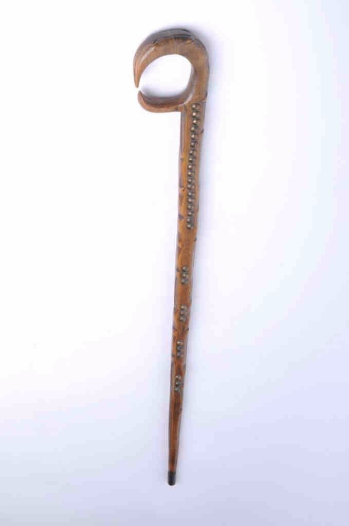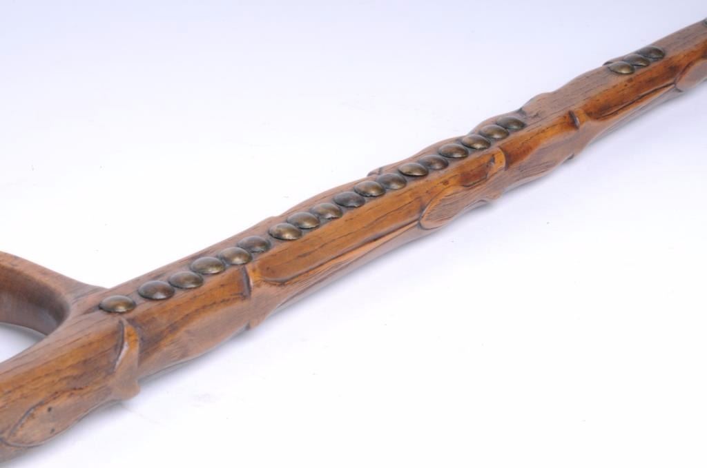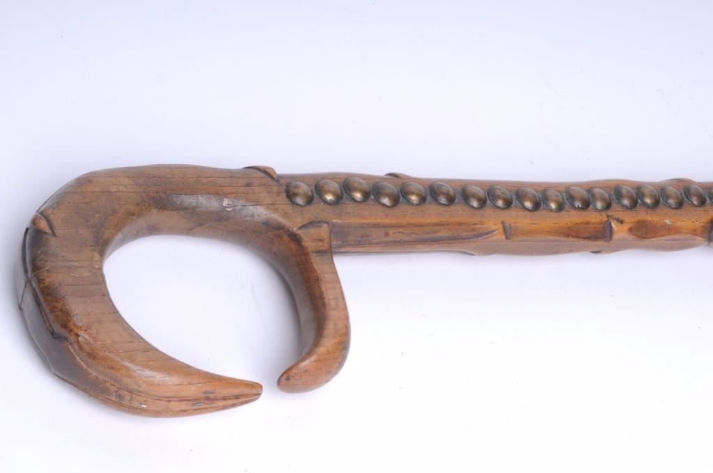 Northwest Coast Native American cane with stylized salmon, whales and eagle claw grip; brass tacks; 34”; late 19th to 20th Century. Est.: $600-$1,200.