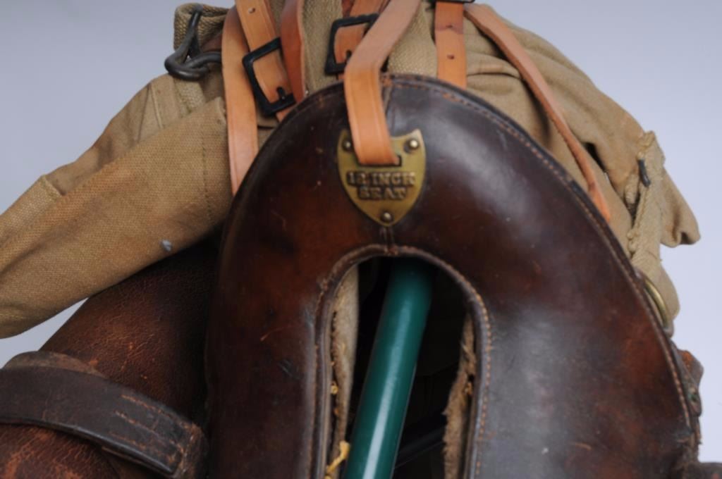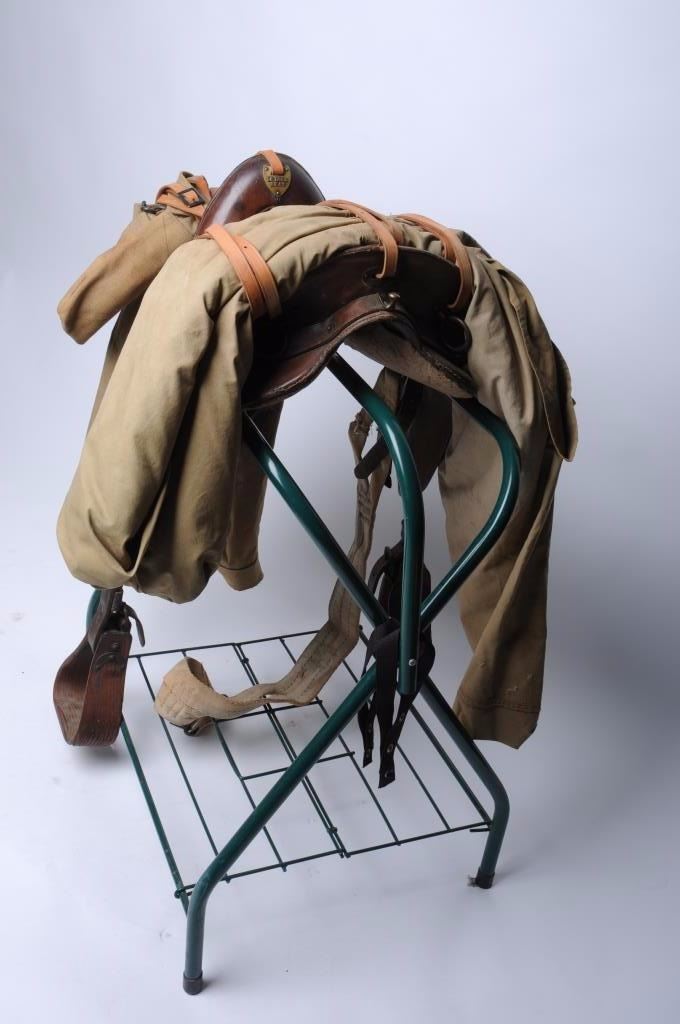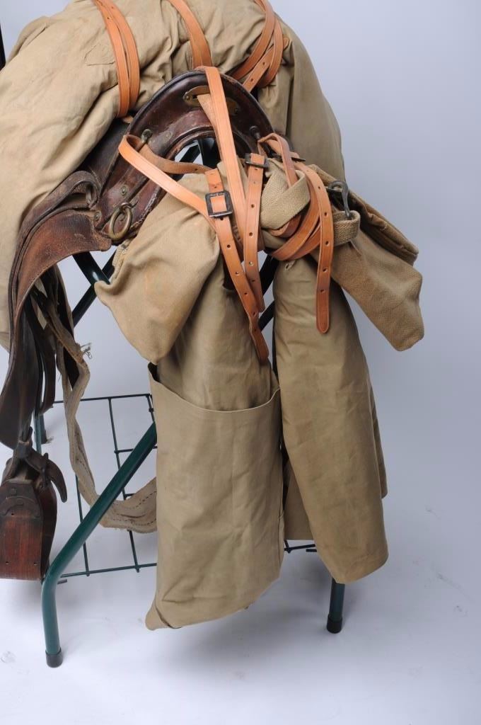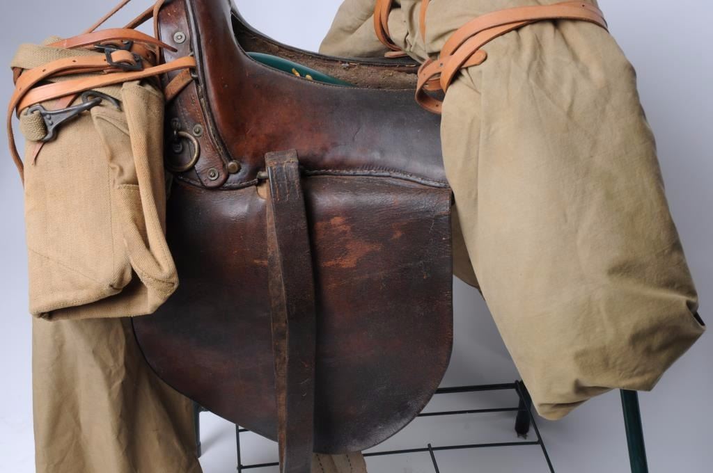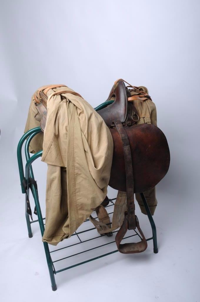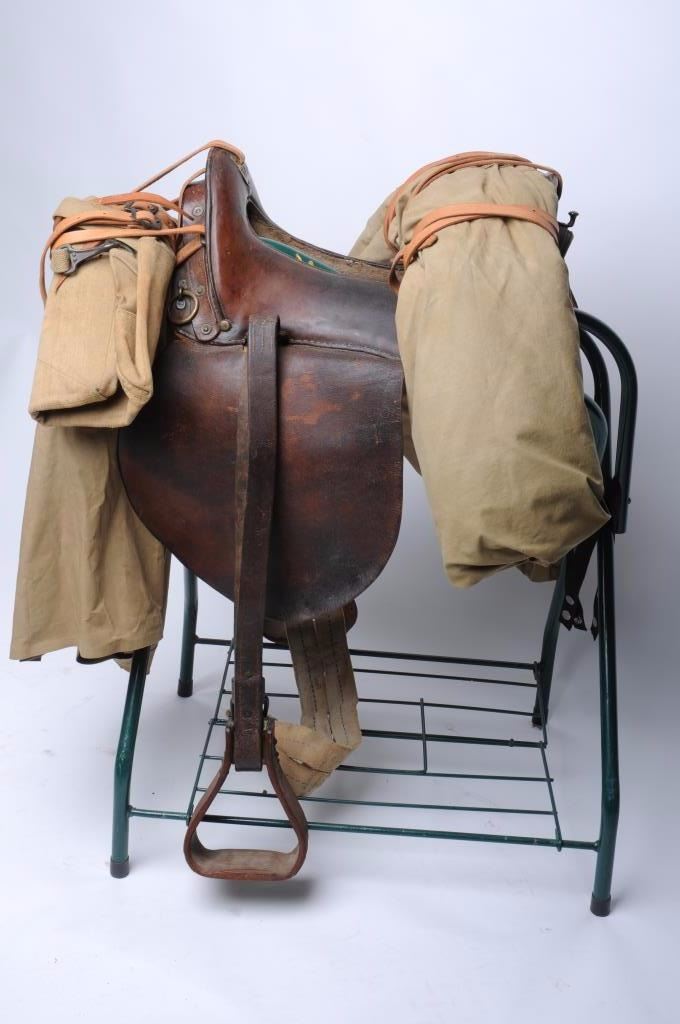 Model 1928 Clinton military saddle with skirts and all rigging is intact; wooden non-hooded stirrups; 6 reproduction coat straps; at the rear of the saddle is an original U.S. military shelter half withpole; the front has a combination military type saddlebag or pack ca. 1918 (rare $200 item by itself) and a poncho; stitching is sound; cushioning under saddle is coming loose but present. Est.: $500-$1,000.
