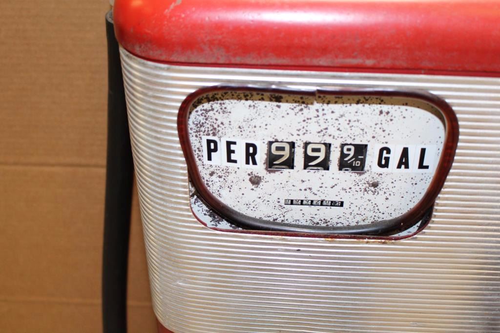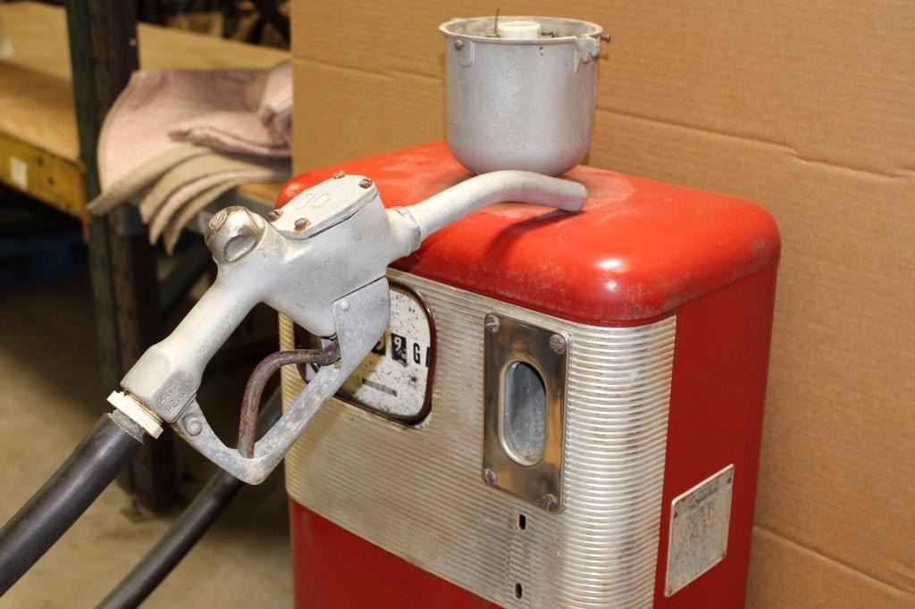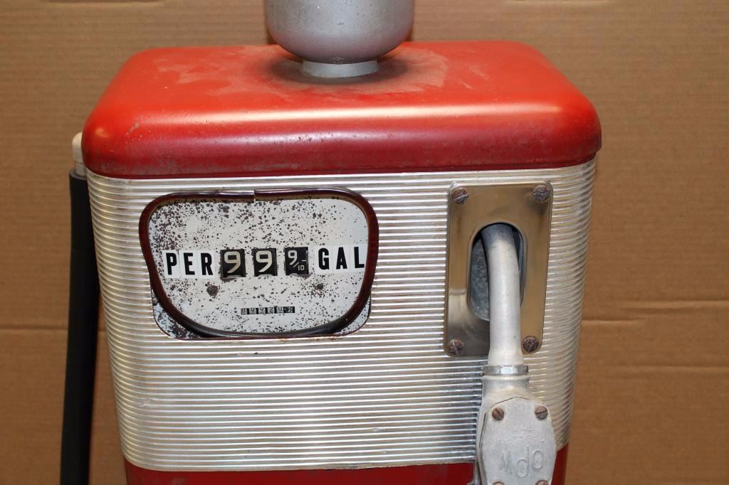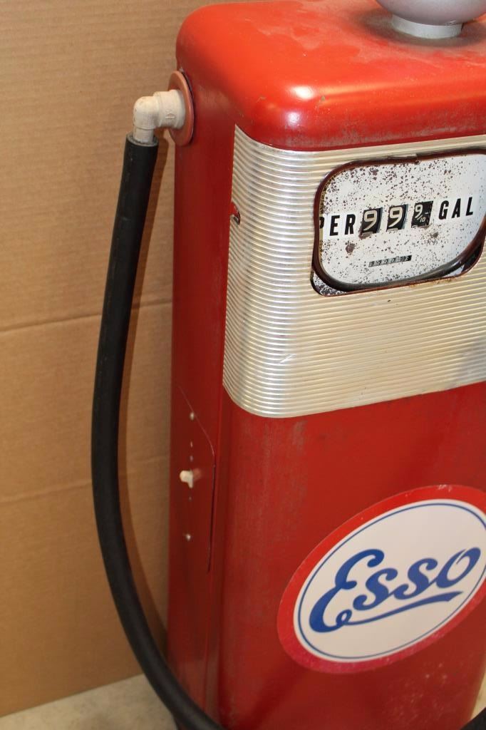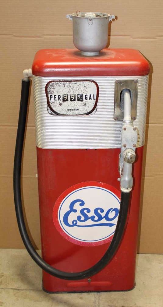 Old Esso metal gasoline pump, approximately 40” in height, 16” wide and 10” deep; missing the top globe. Est.: $500-$900.