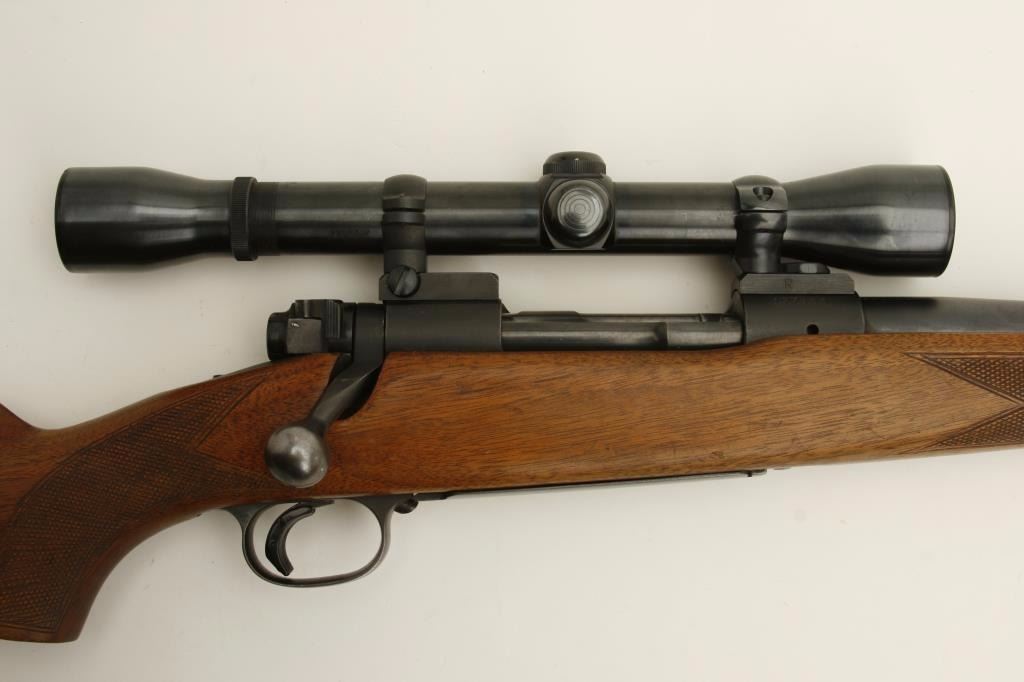 Pre-64 Winchester model 70 bolt action rifle, .220 Swift caliber, 26” round barrel, mat black finish, checkered wood stock, S/N 177835, mounted with a Weaver K4 60-B scope displaying sharp optics. This rifle is inoverall very good to fine condition with a fine bore, crisp action, sharp markings and very good to fine stock. (C&R). Est.: $800-$1,600.