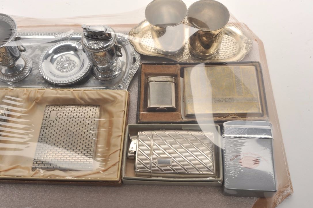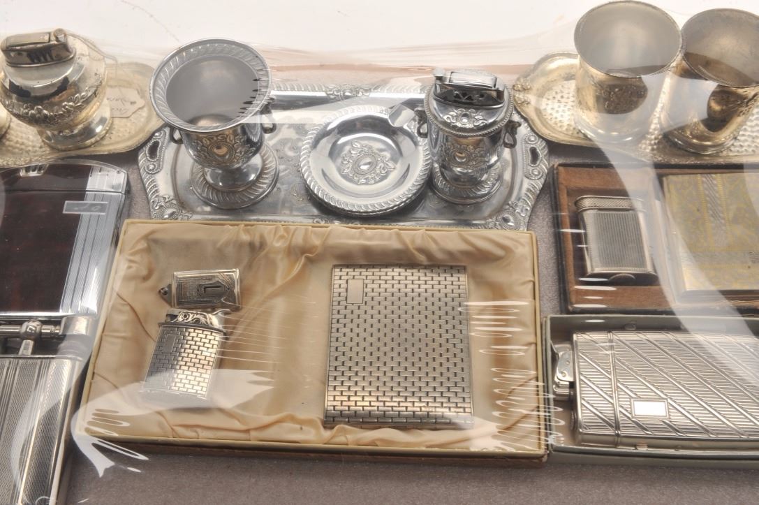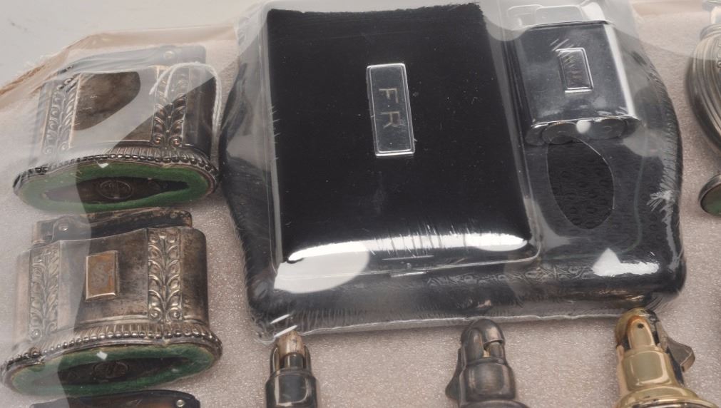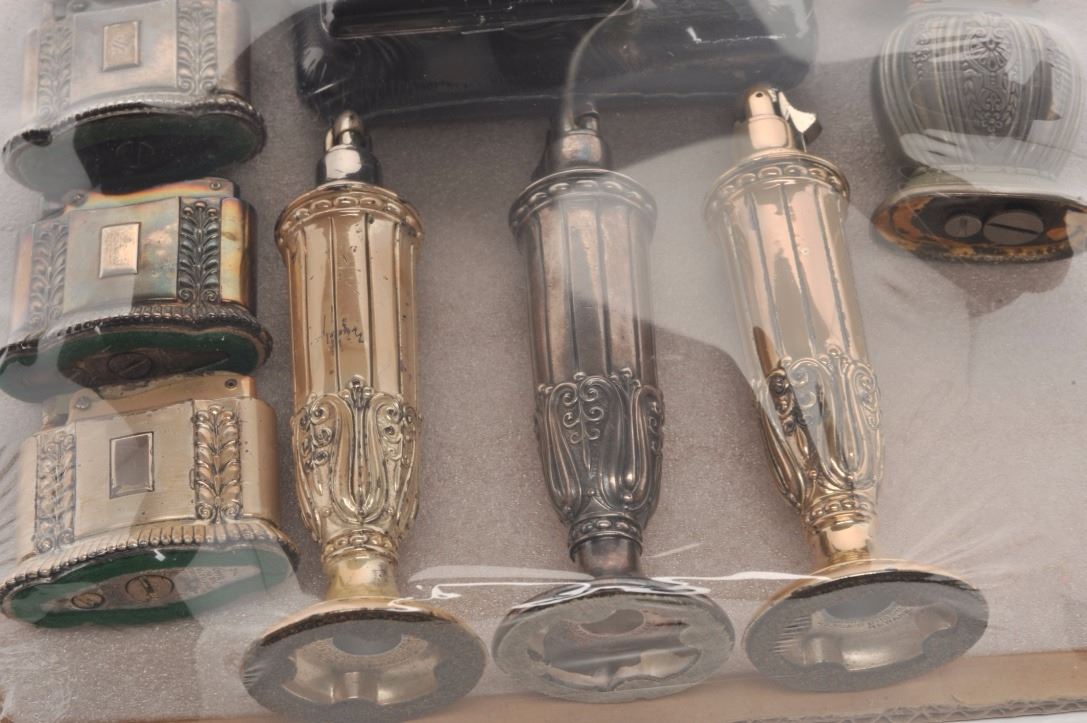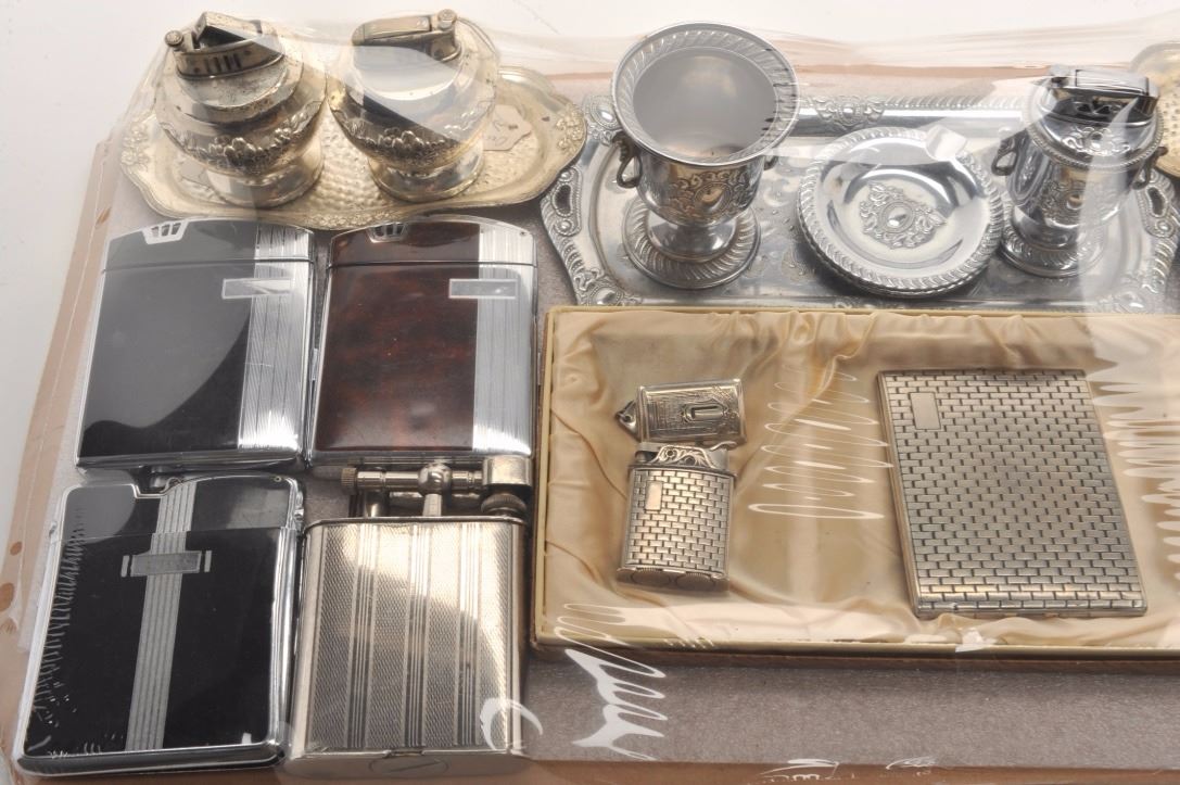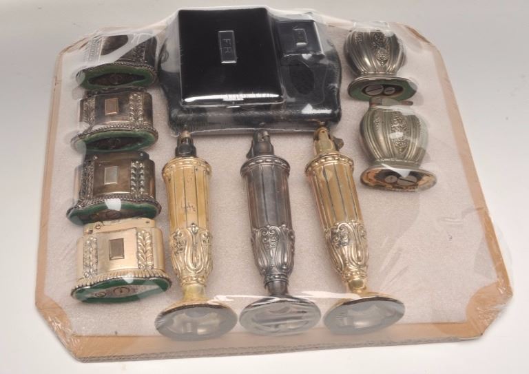 Bonanza lot of misc. novelty lighters and tobacco accessories including a number of items marked “Made in Occupied Japan”; also a novelty “Slot and Lighter” piece, approximately 7” in height x 5” in width and 4” deep; several sets of lighters/cases (3 with boxes); misc. desktop lighters of varying styles and materials and more. (Reference: James Flanagan’s definitive work “The Big Book of Cigarette Lighters”).Est.: $450-$700.