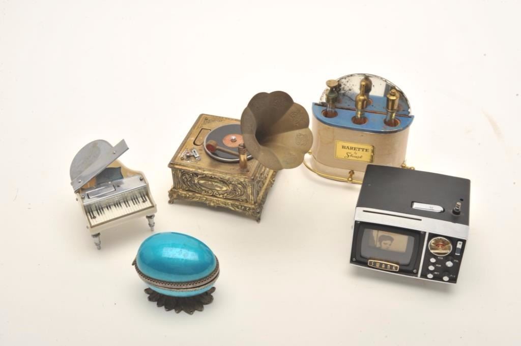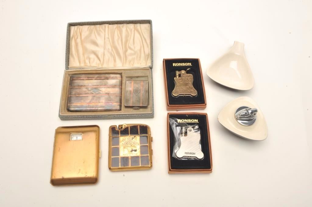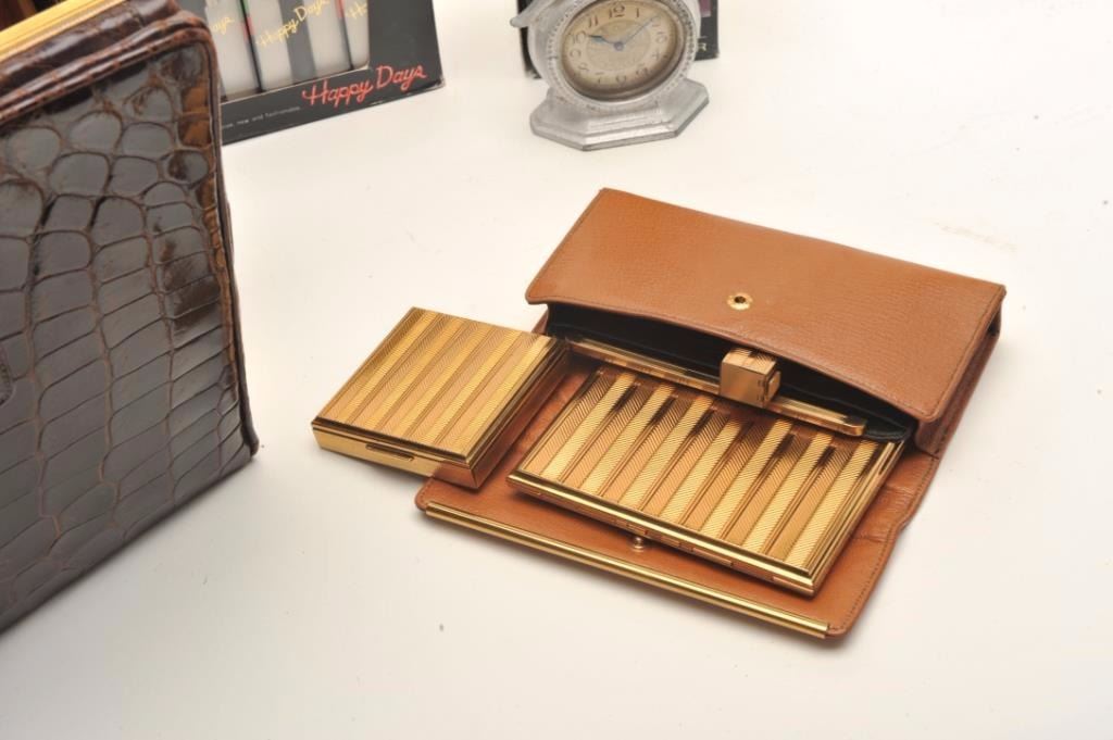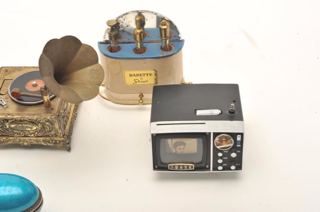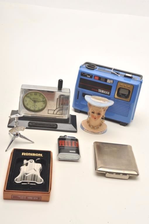 Lot of great vintage novelty and general pocket and tabletop lighters including a metal lighter disguised as a Yamaha portable radio; a telephone bell profile lighter; a grand piano profile lighter by Prince; aVictrola profile lighter; an Art Deco style lighter with clock; a TV style lighter by Swank; a ladies clutch purse by Evans with smoking accessories and more. (Reference: James Flanagan’s definitive work “The Big Book of Cigarette Lighters”). Est.: $350-$500.