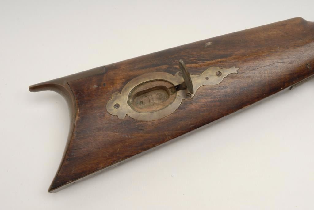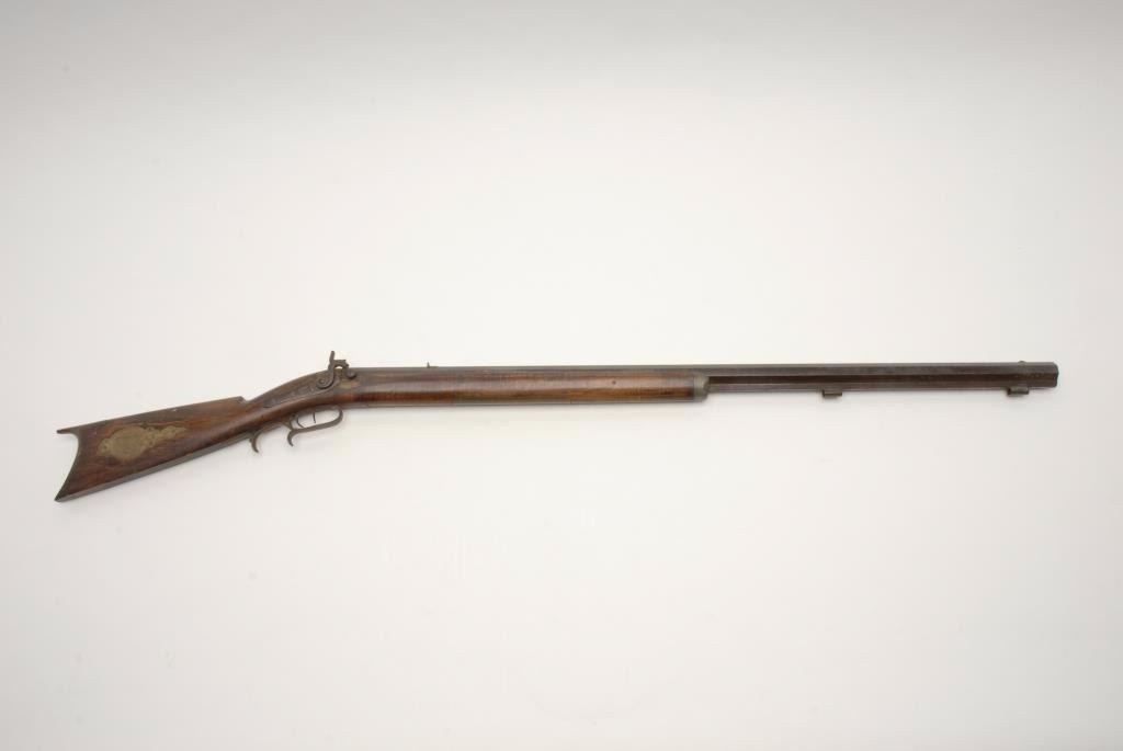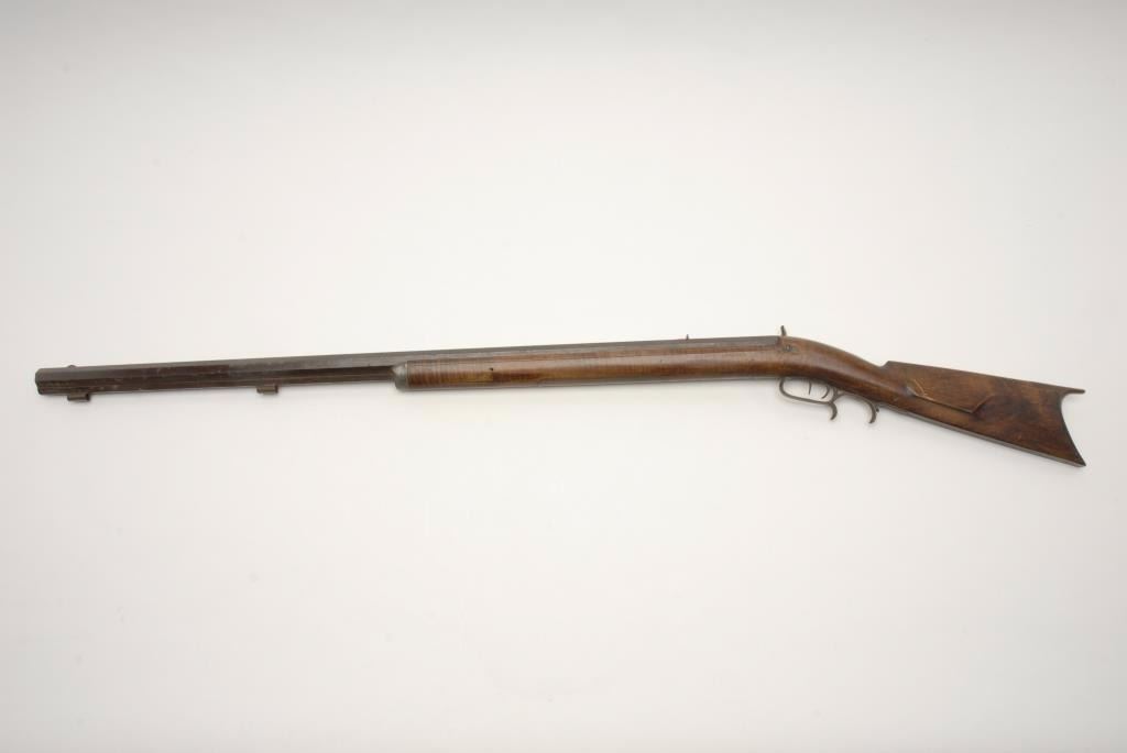 Heavy barrel percussion plains rifle signed “J.F.” on the barrel with back action lock. Measures 54 ½” overall with a 39 ½” barrel of .44 caliber rifled and measures 1 1/8” across the flats of the barrel. This rifleshows brass mounts, patch box, and double set trigger and no ramrod. As found in “Out of the attic” condition. Good to very good with minor stress cracks to the wood and normal aging. (Antique) Est.: $400-$800