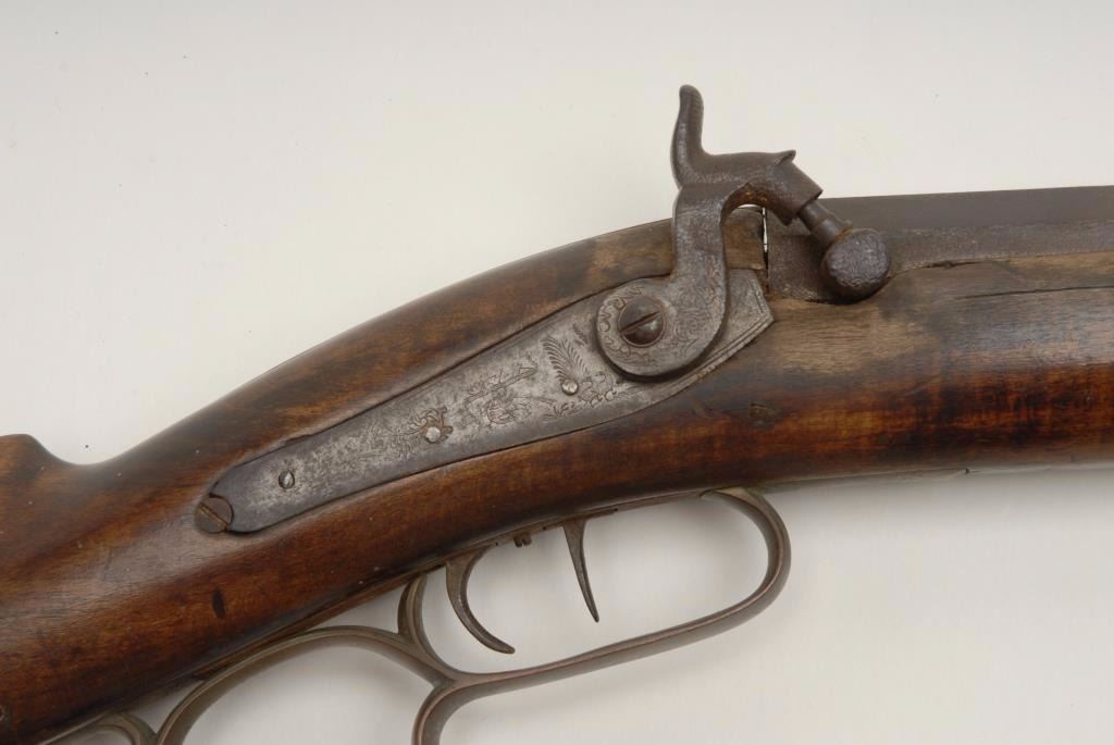Lot 1823 Heavy barrel percussion plains rifle signed “J.F.” on the barrel with back action lock. Measures 5