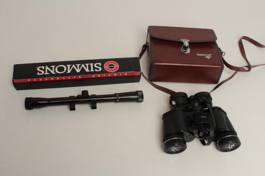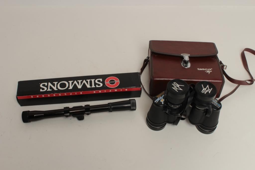 Lot including a Tasco Zip Model pair of binoculars, 6X-18X35 with case in good condition and a Simmons Model 1003 scope in factory box, 4X20. Est.: $100-$200.