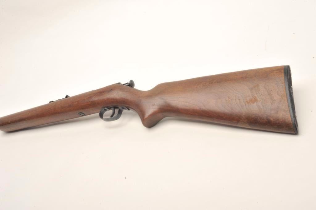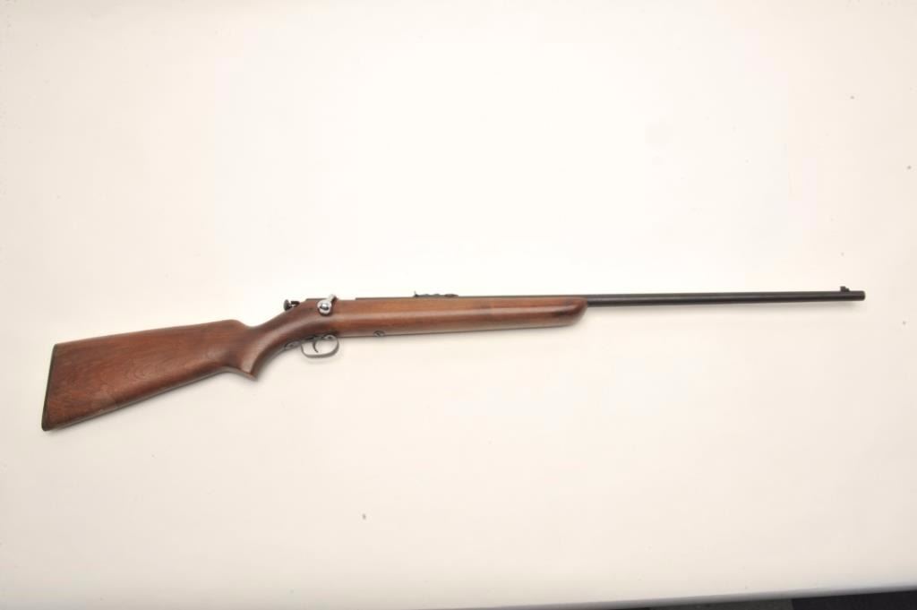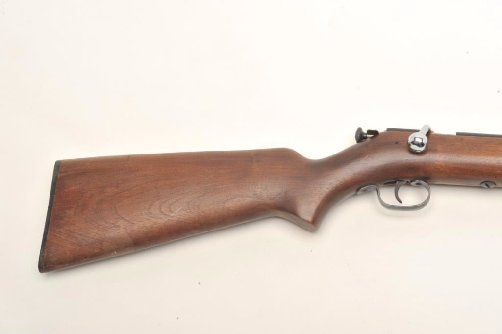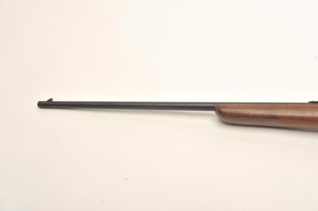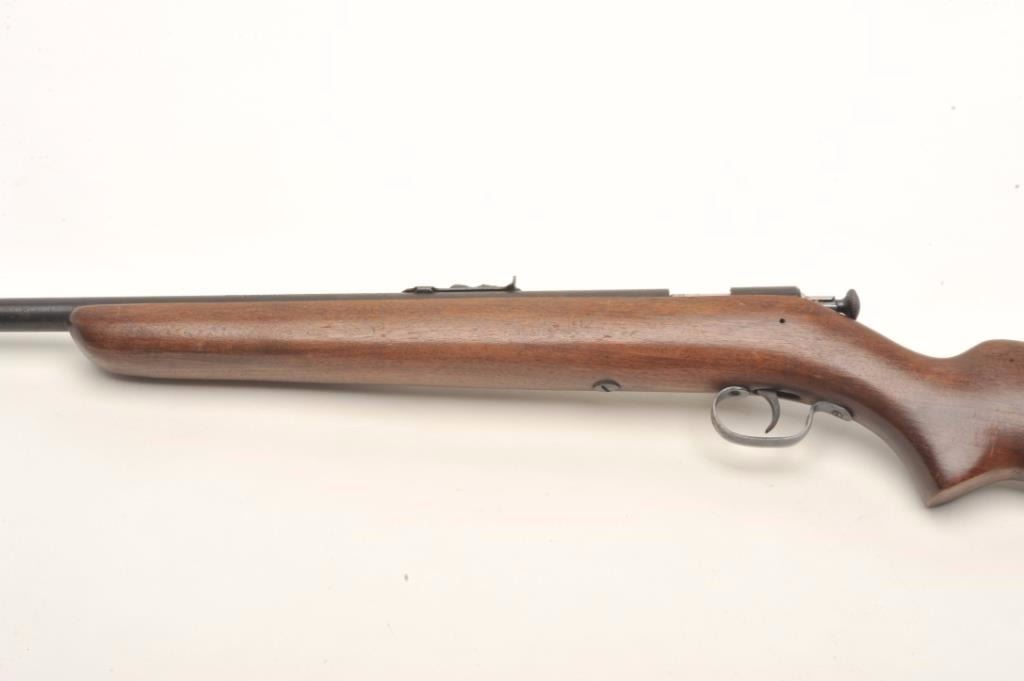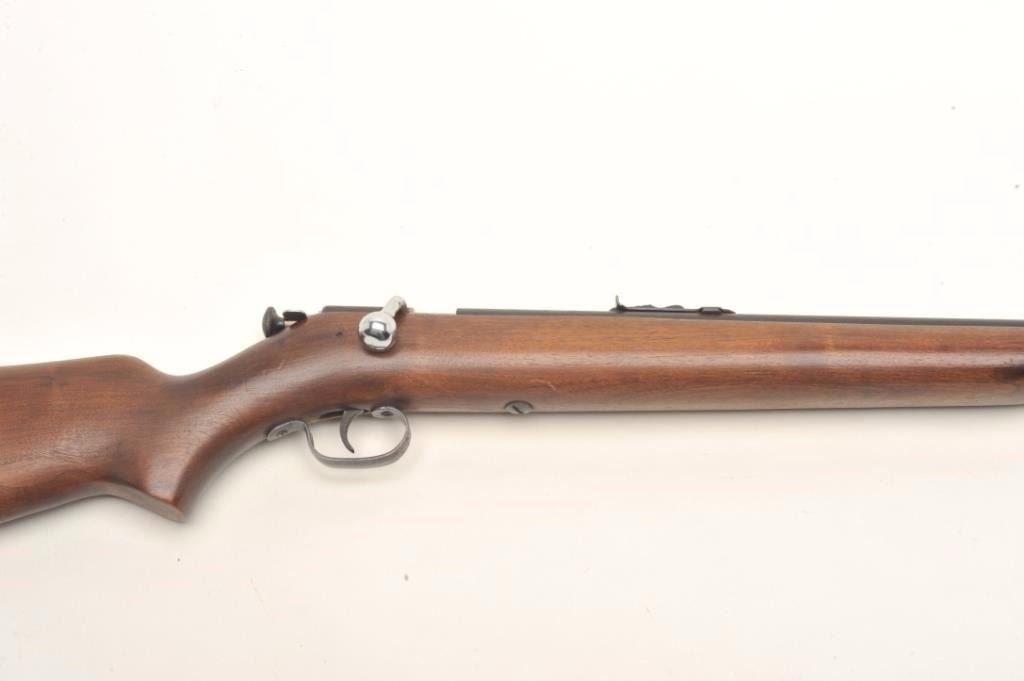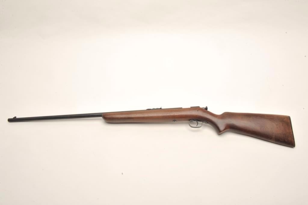 Winchester Model 67 bolt action single shot rifle, .22 S,L, LR caliber, serial #NSNV. The rifle is in good overall condition with a 26” barrel with ramp front and standard rear sights. The barrel and receiver retain themajority of their blued finish with light to moderate surface rust noted. The smooth wood stock is in good condition with mars, dents and small losses of finish consistent with use. The butt stock ends with a plasticWinchester marked butt plate. The bore is fair, the action crisp and markings are legible. Est.: $50-$75. (Modern).