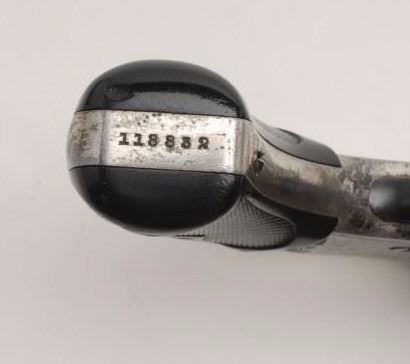 Smith & Wesson New Departure hammerless DA revolver, .32 caliber, 3.5” barrel, S/N 118832, in overall fair to good condition showing scattered spots of erosion and pitting, sideplate screw head damaged; goodaction, bore shows some spots of pitting, slight traces of nickel finish, good checkered hard rubber grips showing wear . (C&R). Est.: $150-$300.