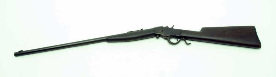 Stevens “Favorite” Model 1915 Falling Block Rifle, .22 L.R., 24” round barrel, wood stock, S/N X191. This rifle remains in fair condition showing a brown patina along with areas of knackering to the barrel and largescratchers on the right side of the frame where the screw head has broken off. The stock remains in fair condition with dings and scratches along with the name “ARDE” scratched on the left side of the butt stockand also a crack at the wrist. The butt plate is broken and is loose. The action is crisp and the bore is good. (C&R) Est.: $150-$300