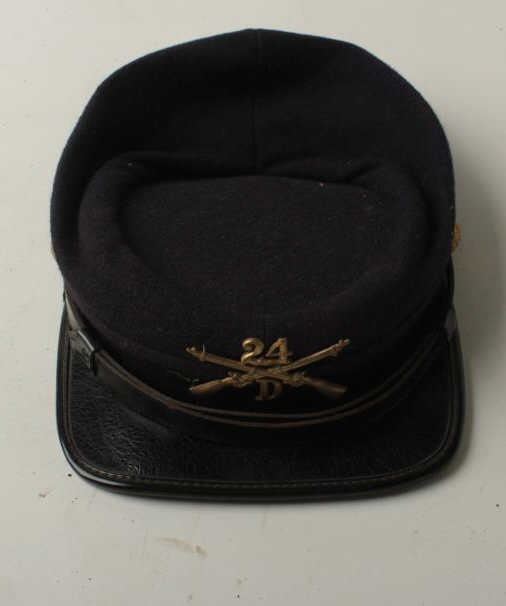 Indian War period U.S. Army kepi with infantry insignia on front; overall in good condition but likely a well-used reproduction. Est.: $200-$400.