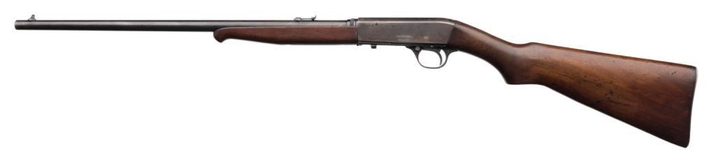 *Remington Model 24 semi-automatic rifle, .22LR caliber, 19” barrel, blued finish, wood stocks in overall very good condition; crisp action, very good bore. Est.: $350-$700.