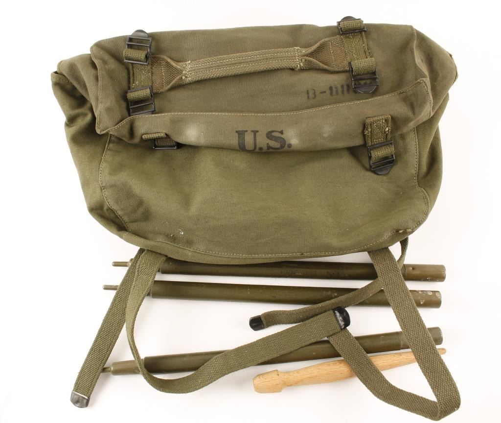 U.S. military green canvas field and cargo pack dated 1945 with tent pegs and assembly instructions document. Est.: $75-$150.