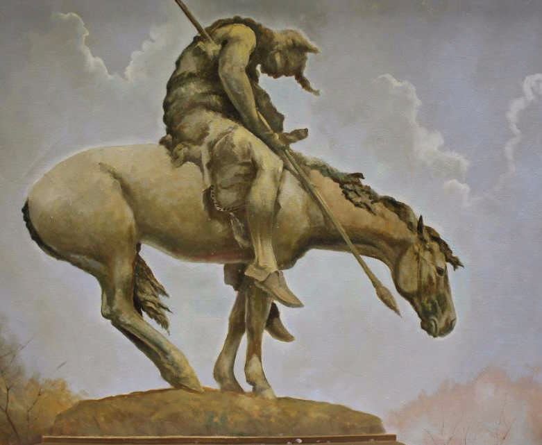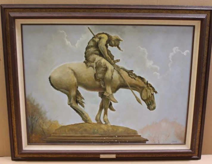 Large framed painting by S.V. Dougherty of Indian warrior on horseback in the style of the classic “End of the Trail” creation by James Earl Fraser, approximately 40” x 49” overall. Est.: $300-$600.