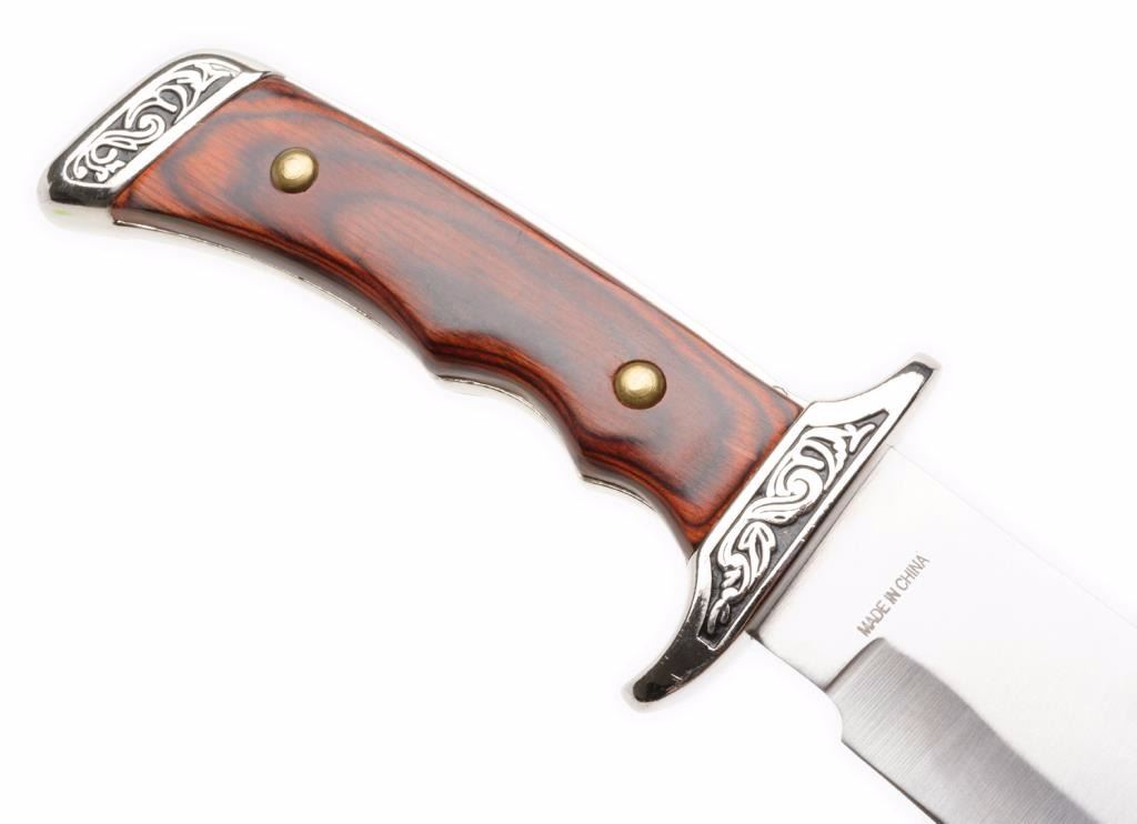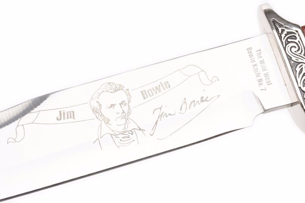 The Wild West Series #7 Jim Bowie knife with plain cardboard box, approximately 13” overall with an 8.5” blade, wood grip and decorated simple cross guard and pommel; like new condition. Est.: $125-$175.