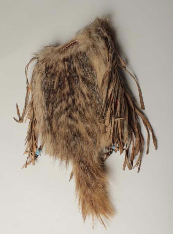 Contemporary to last 50 years Indian trappers type bag with beadwork, fringe and large old trade beads; type worn in the 1970’s at Rendezvous; authentic styling of an earlier period. Est.: $150-$300.