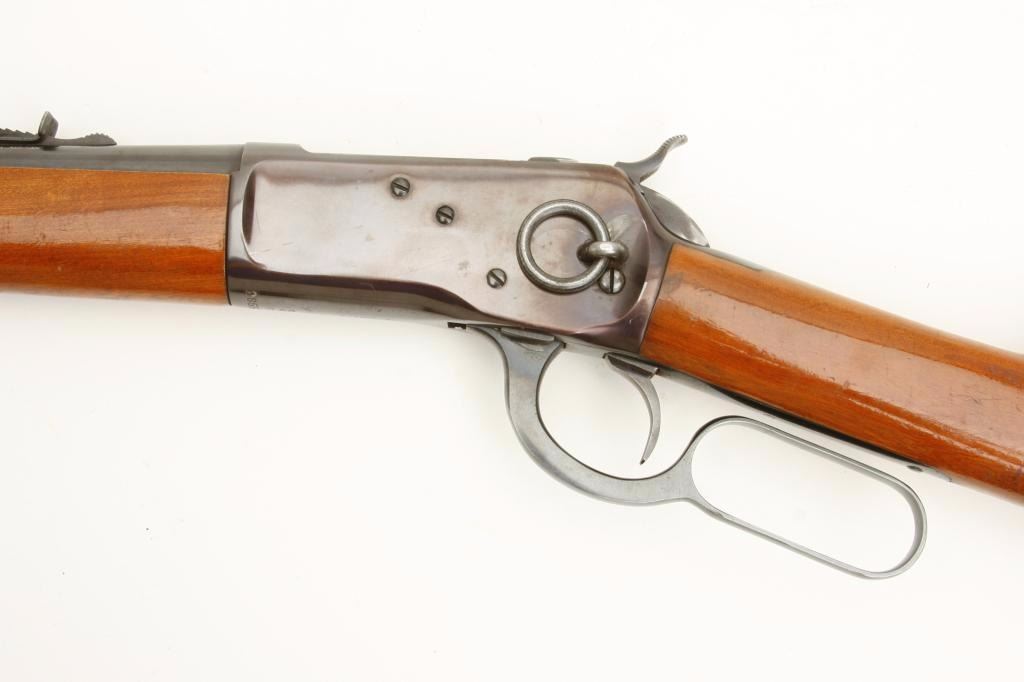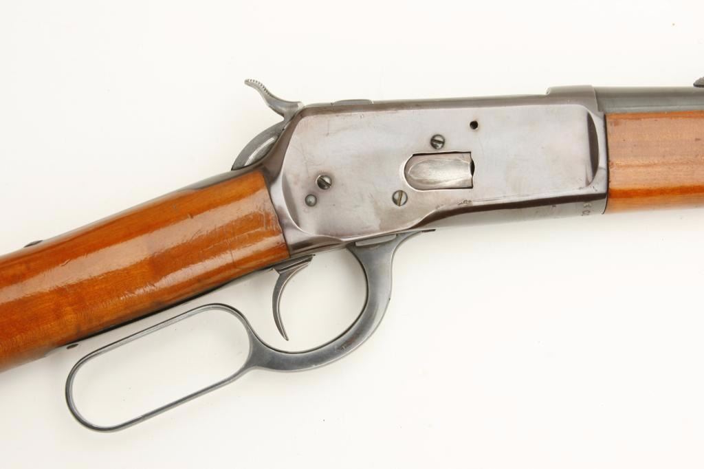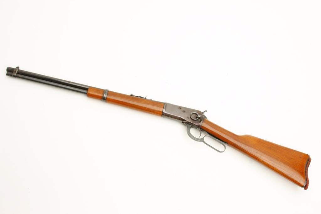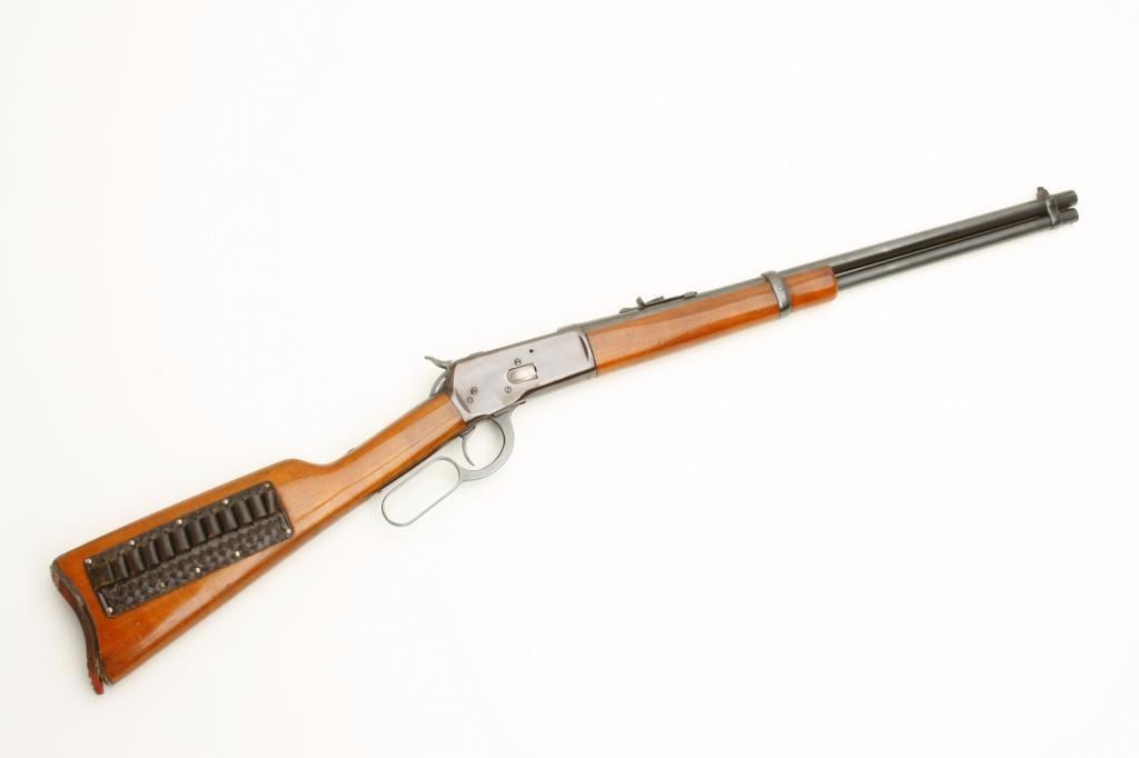 Rossi Model 92 lever action saddle ring carbine, .38 Spl./.357 Mag. caliber, serial #K009983. The carbine is in good condition with a 20” import marked barrel. The barrel and full-length magazine retain the majorityof their high polish blued finish. The receiver shows the majority of its blued finish with a small loss of finish on the right side of the action. The saddle ring is intact. The smooth wood stocks are in good condition with handling marks and cartridge holder tacked to the right side. The butt stock ends with a smooth, metal crescent butt plate, which has been covered with an old piece of rubber foam. The bore is very good, the action crisp and markings are sharp. (Modern) Est.: $200-$400.