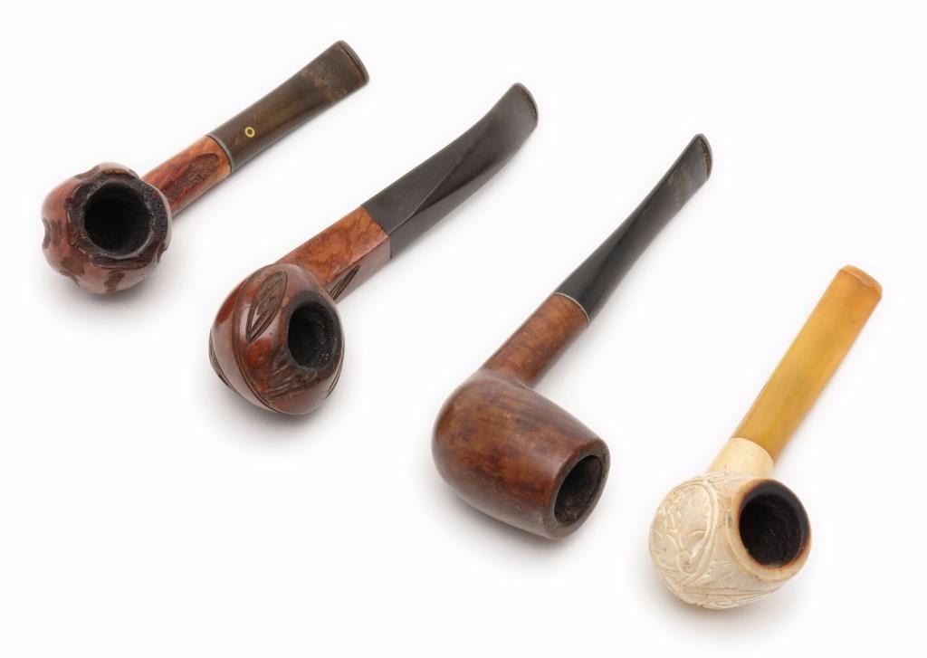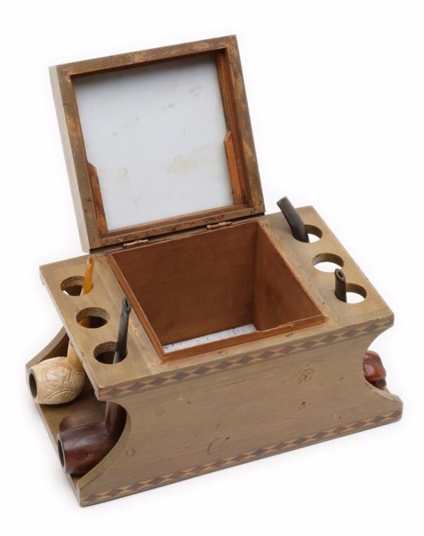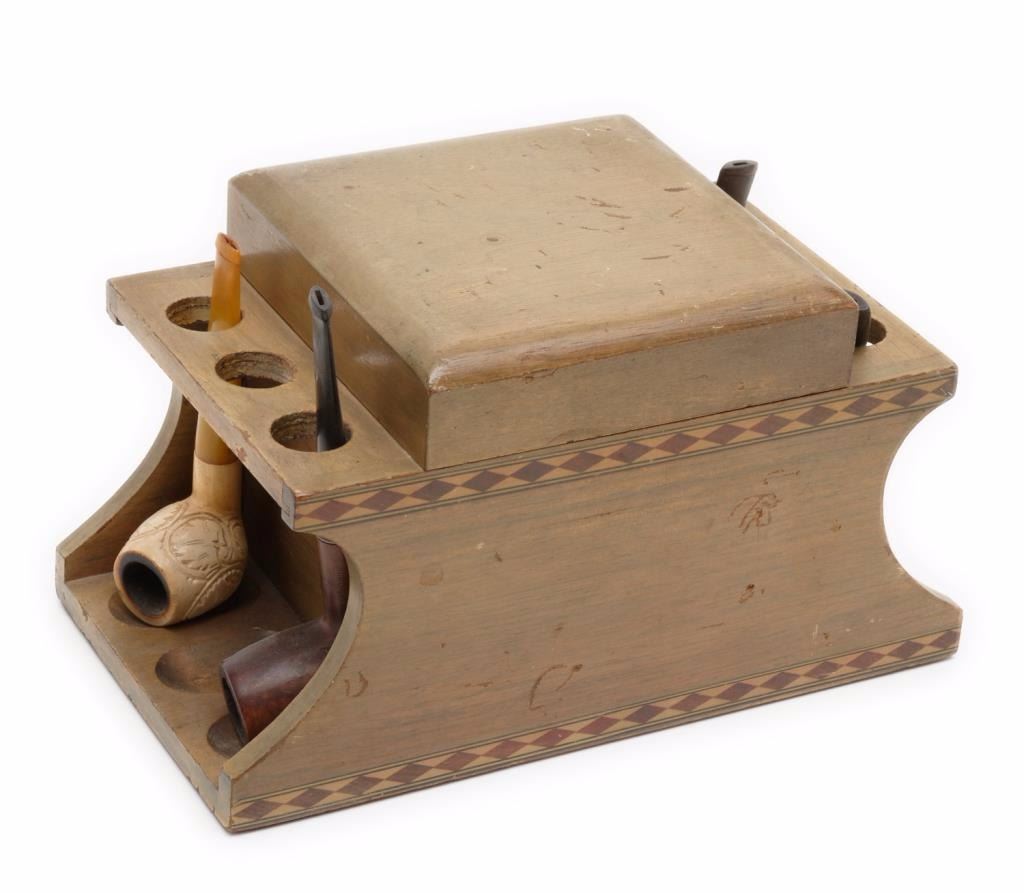 Old wooden smoking pipe stand with built-in humidor, approximately 10” x 5.5” x 6” overall including 4 old smoking pipes. Est.: $50-$75.