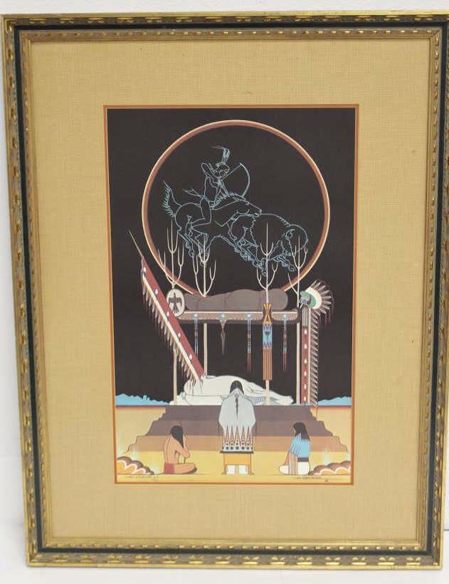 Large framed and matted limited edition (29/500) color print of sacred Indian burial ceremony by Archie Blackowl entitled “Cheyenne Brave”, approximately 44” x 33” overall. Est.: $125-$250.