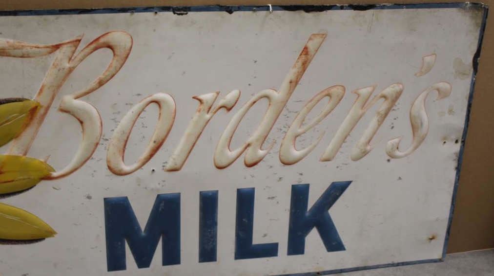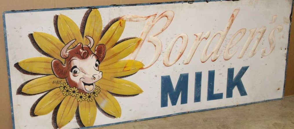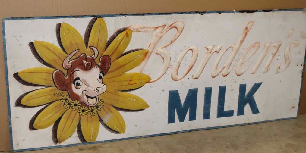 Massive painted metal sign advertising Borden’s Milk with “Elsie” the cow mascot; approximately 29” x 72”; some scattered chips; some wear but overall good. Est.: $400-$700.